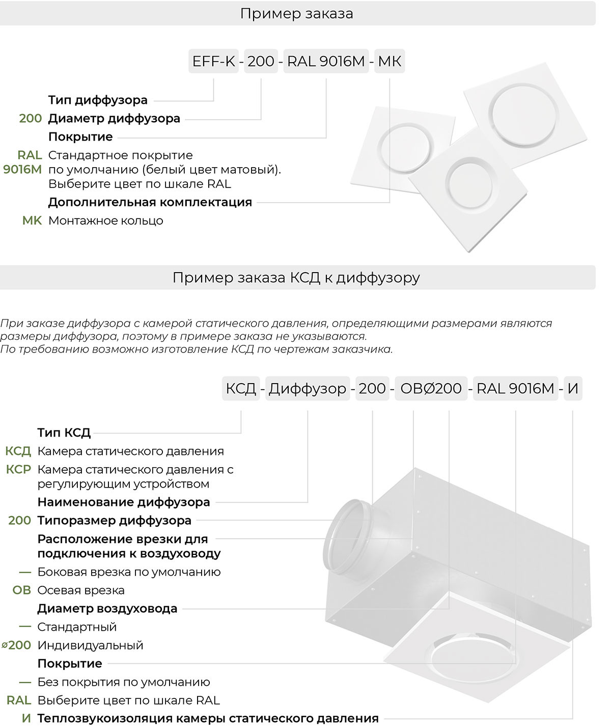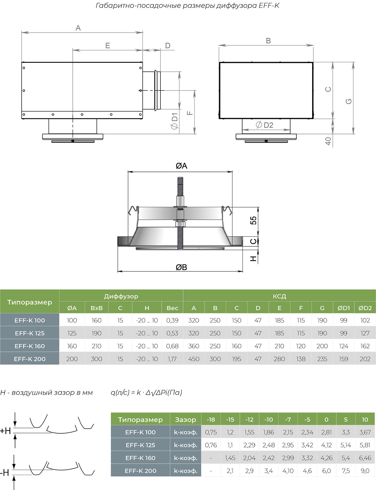 Диффузор EFF-K состоит из впускного конуса с уплотнительным кольцом и центрального регулировочного диска. Вращение диска позволяет точно настраивать расход воздуха, перепад давления или полностью перекрывать воздушный поток.