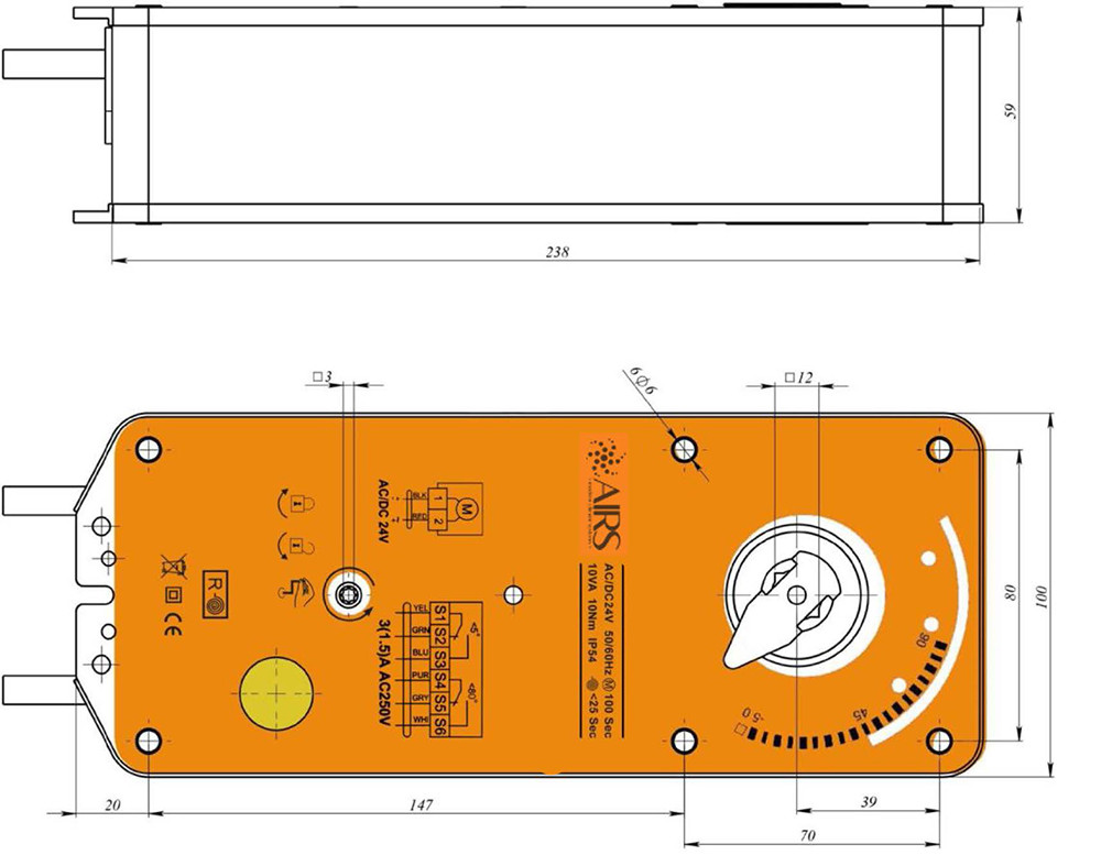 Устройство оснащено встроенными переключателями для сигнализации положений створки при углах поворота 5° и 90°. Монтаж осуществляется на клапан с квадратным приводным валом 12 мм через крепежные отверстия ø6 мм.