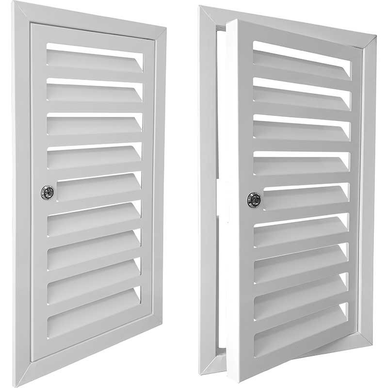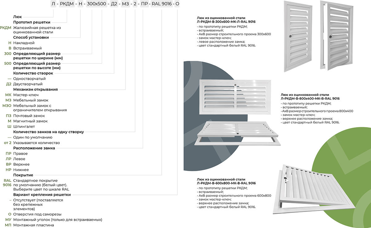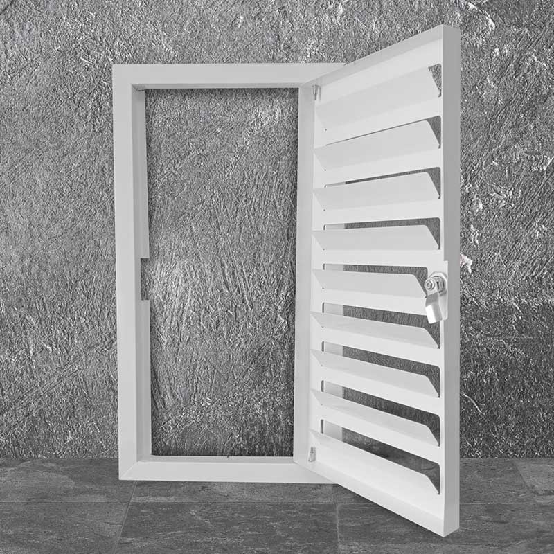 Люк состоит из рамки и распашной створки с ламелями, отогнутыми внутрь на 30 мм. Производится в одностворчатом и двустворчатом исполнении, с возможностью установки различных механизмов открывания в зависимости от требований эксплуатации.