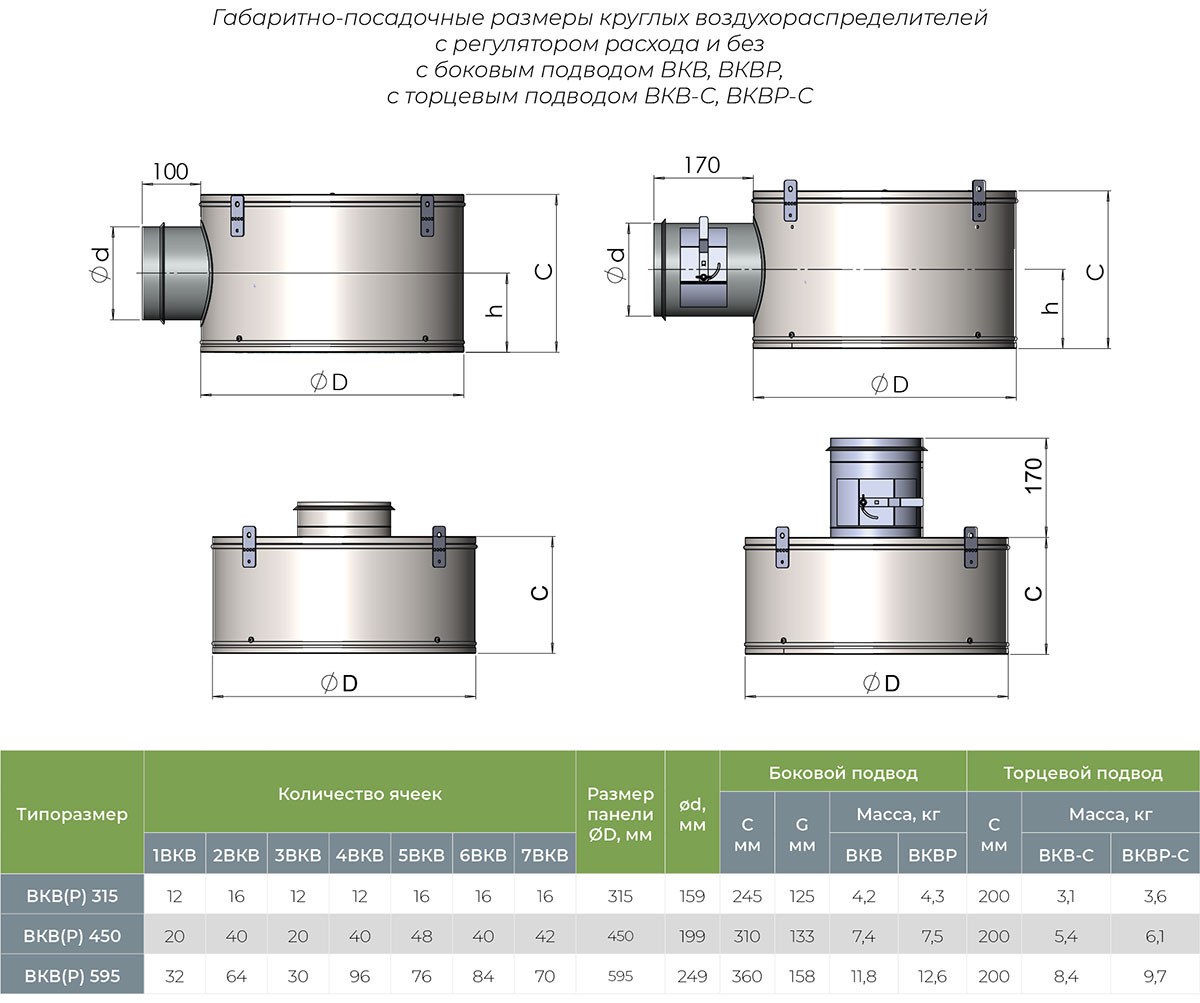 Семь вариантов расположения ячеек предоставляют широкие возможности для адаптации воздухораспределителя к конкретным условиям помещения. Модель ВКВР дополнительно оснащается регулятором расхода воздуха, установленным в подводящем патрубке, что позволяет точно контролировать объем подаваемого воздуха.
