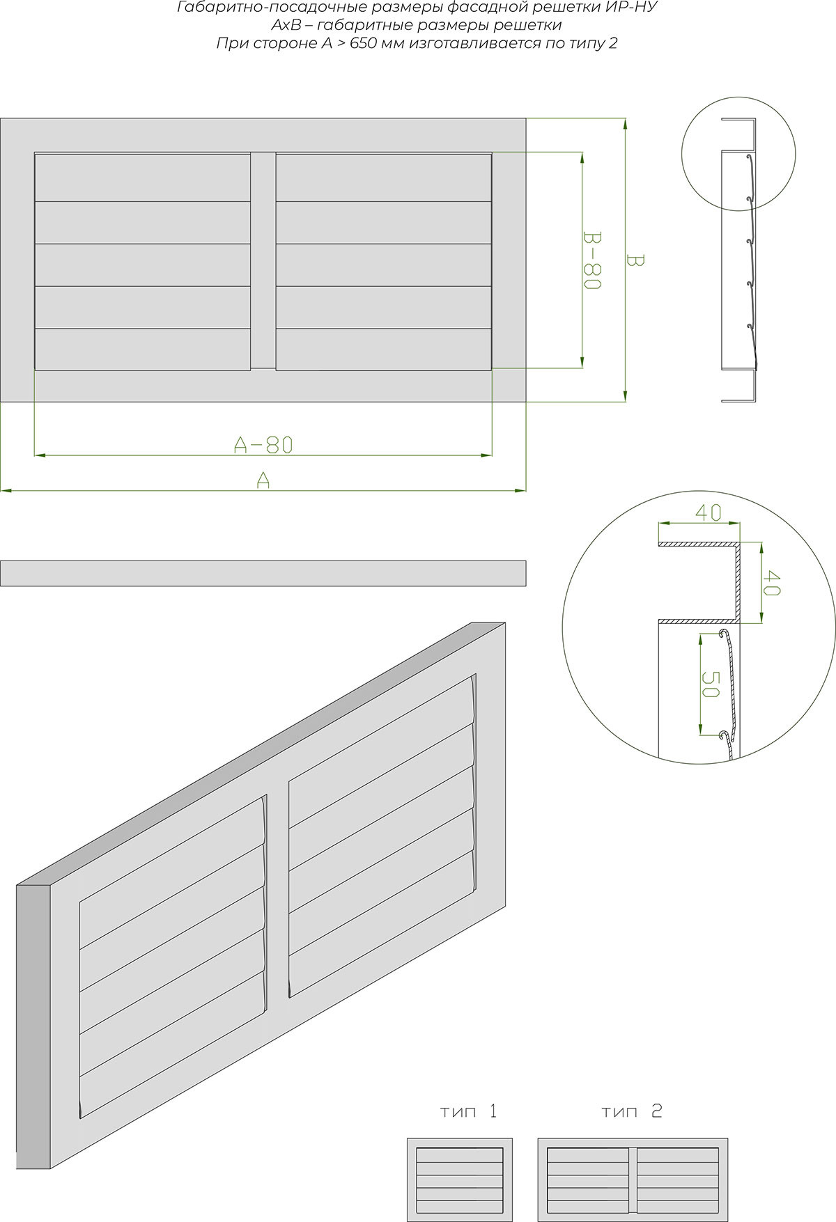 Основное отличие решетки ИР-НУ от модели ИР-У заключается в накладном типе исполнения без внешнего фланца. Устройство оснащено жалюзи, которые автоматически закрываются под собственным весом при отсутствии воздушного потока, выполняя функцию обратного клапана. В конструкции используется швеллер 40×40 мм, обеспечивающий необходимую жесткость.