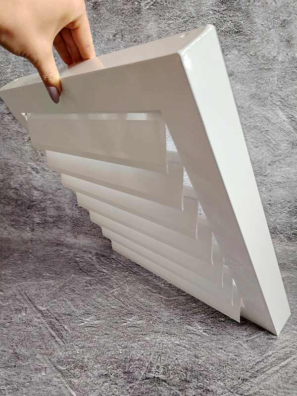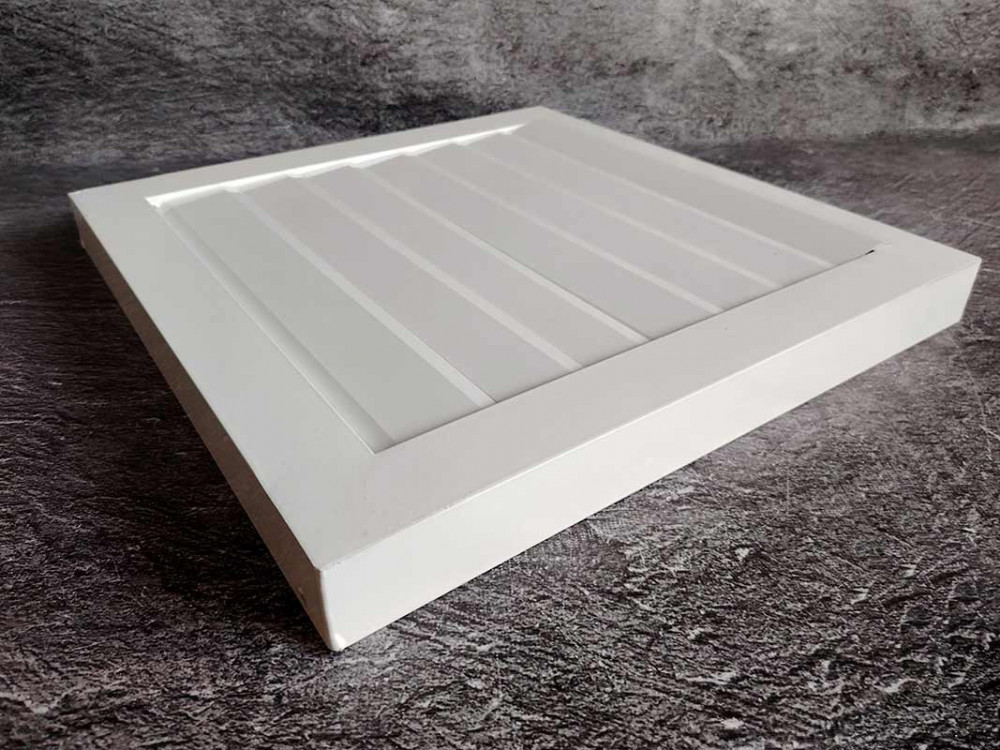 Решетка может комплектоваться адаптером для подключения к воздуховоду. Стандартное покрытие - полиэфирная порошковая краска белого цвета (RAL 9016), по запросу доступна окраска в другие цвета по шкале RAL.