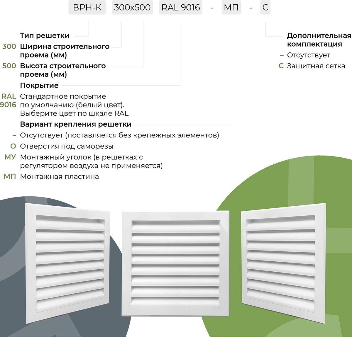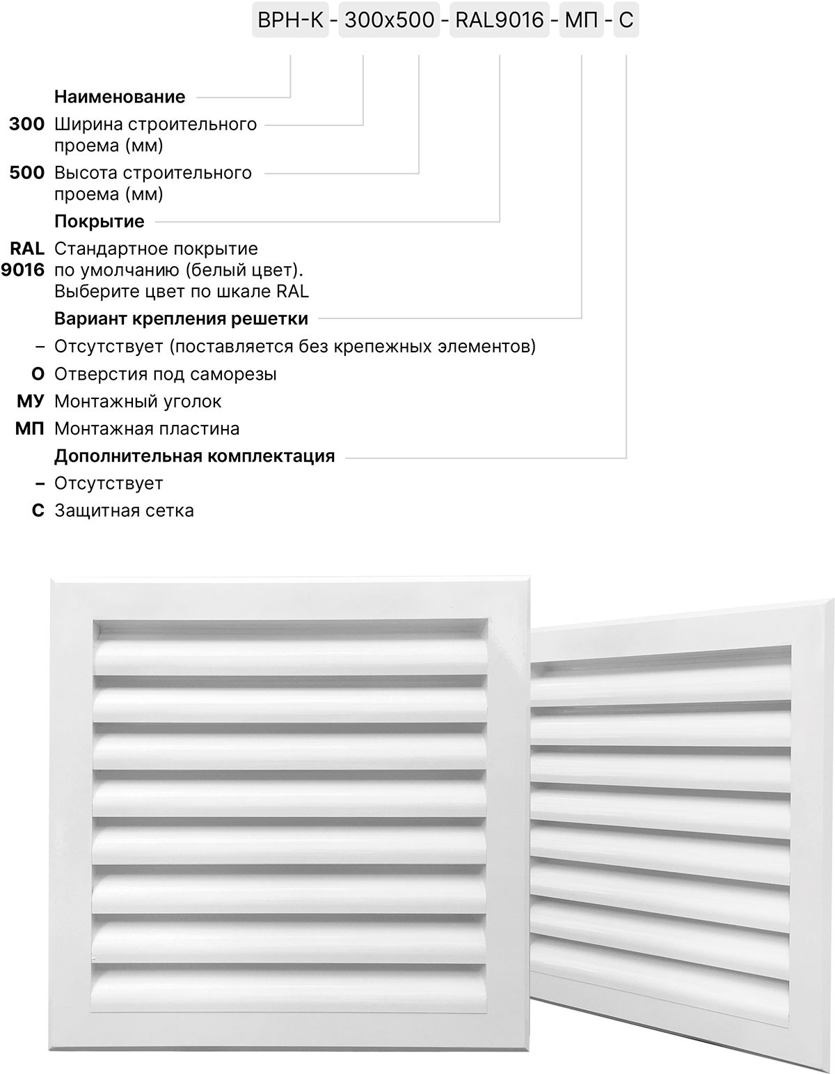 Решетки ВРН-К изготавливаются из запатентованного алюминиевого профиля АДЗ1 (ГОСТ 22233-2001) с порошковым полиэфирным покрытием стандартного белого цвета RAL 9016 или любого другого цвета по шкале RAL по запросу.
