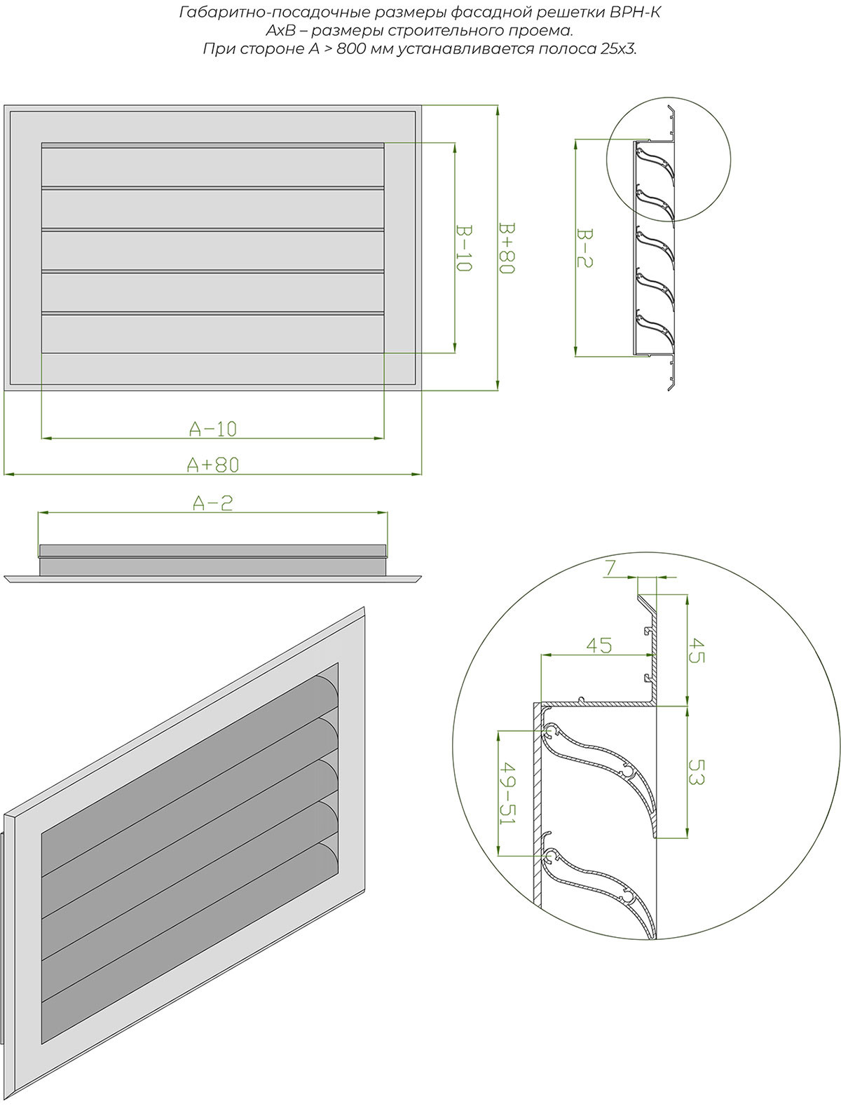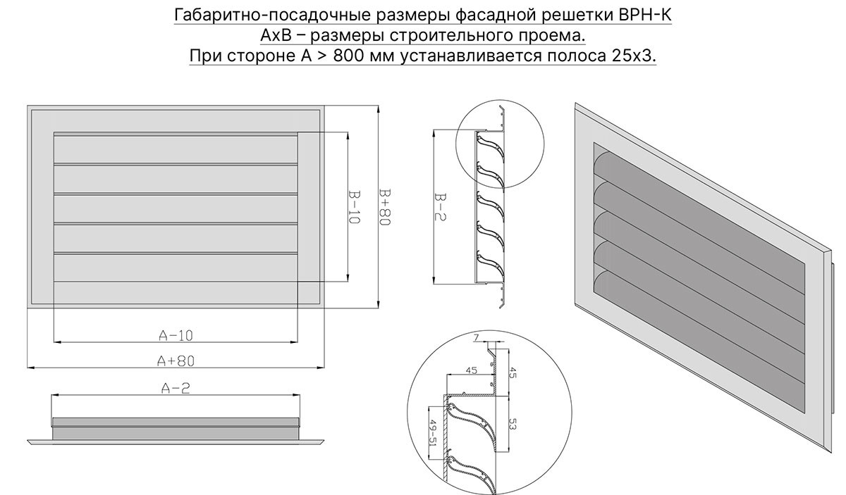 Производитель предлагает изготовление решеток ВРН-К в широком размерном диапазоне - от стандартных до индивидуальных размеров до 6000×3000 мм. Конструкция сохраняет надежность и устойчивость даже при максимальных габаритах.