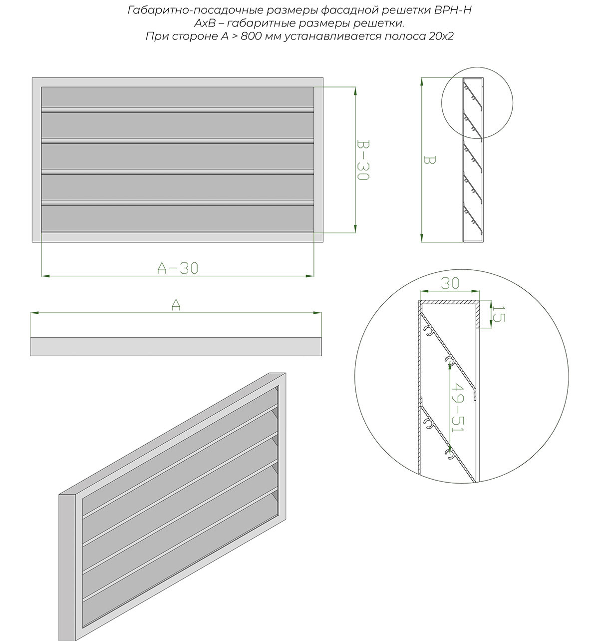 Решетка ВРН-Н монтируется непосредственно на проем или утапливается в него, что позволяет органично вписать ее в любую архитектурную концепцию. Z-образные ламели под углом 35° эффективно защищают вентиляционную систему от дождя и снега, сохраняя при этом отличные аэродинамические характеристики.