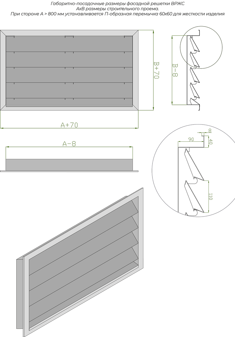 Стандартные размеры решеток ВРЖС варьируются в широком диапазоне, что позволяет подобрать оптимальное решение для конкретных условий монтажа. По специальному заказу возможно изготовление нестандартных размеров с учетом индивидуальных требований заказчика.