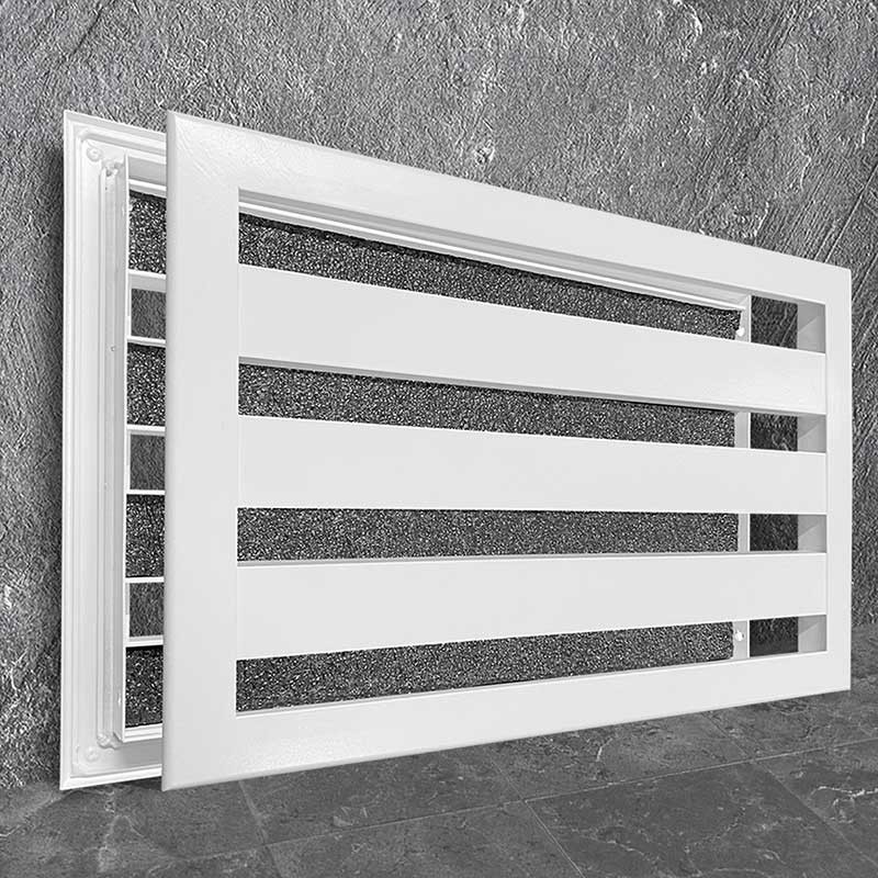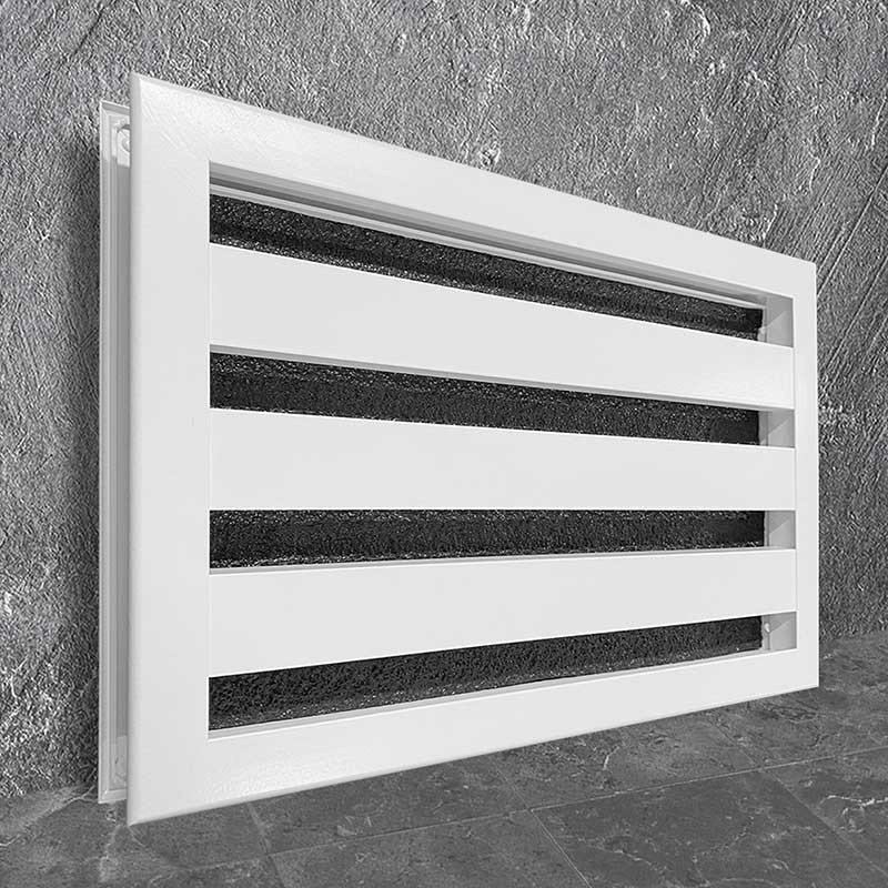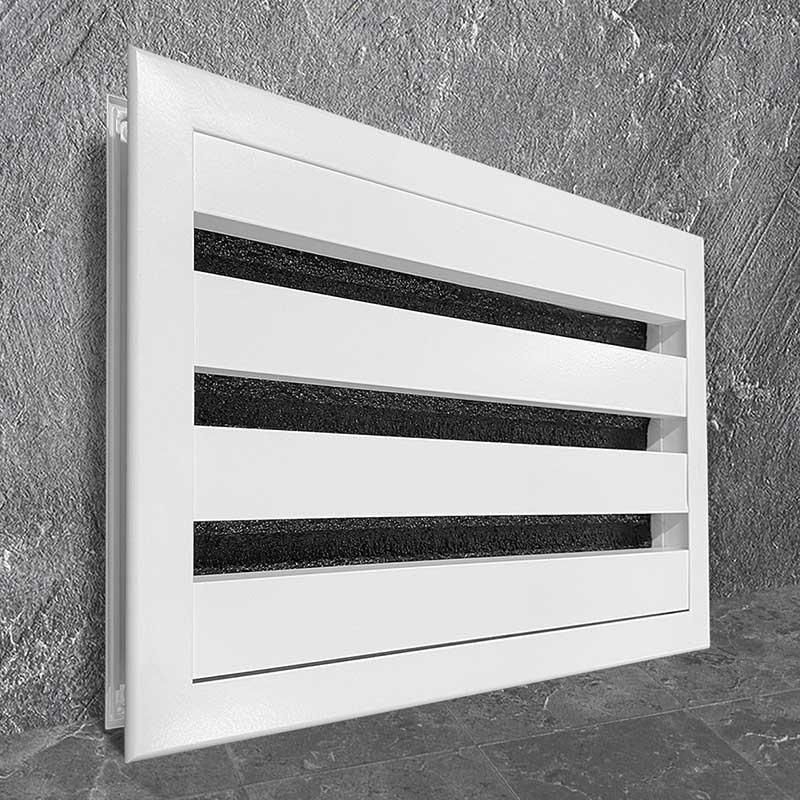 Решетка ПР-АКУСТИК эффективно сочетает функции воздухообмена и звукоизоляции. Специальное шумопоглощающее покрытие на жалюзи значительно снижает уровень проникающего шума, сохраняя при этом оптимальный воздушный поток между помещениями.