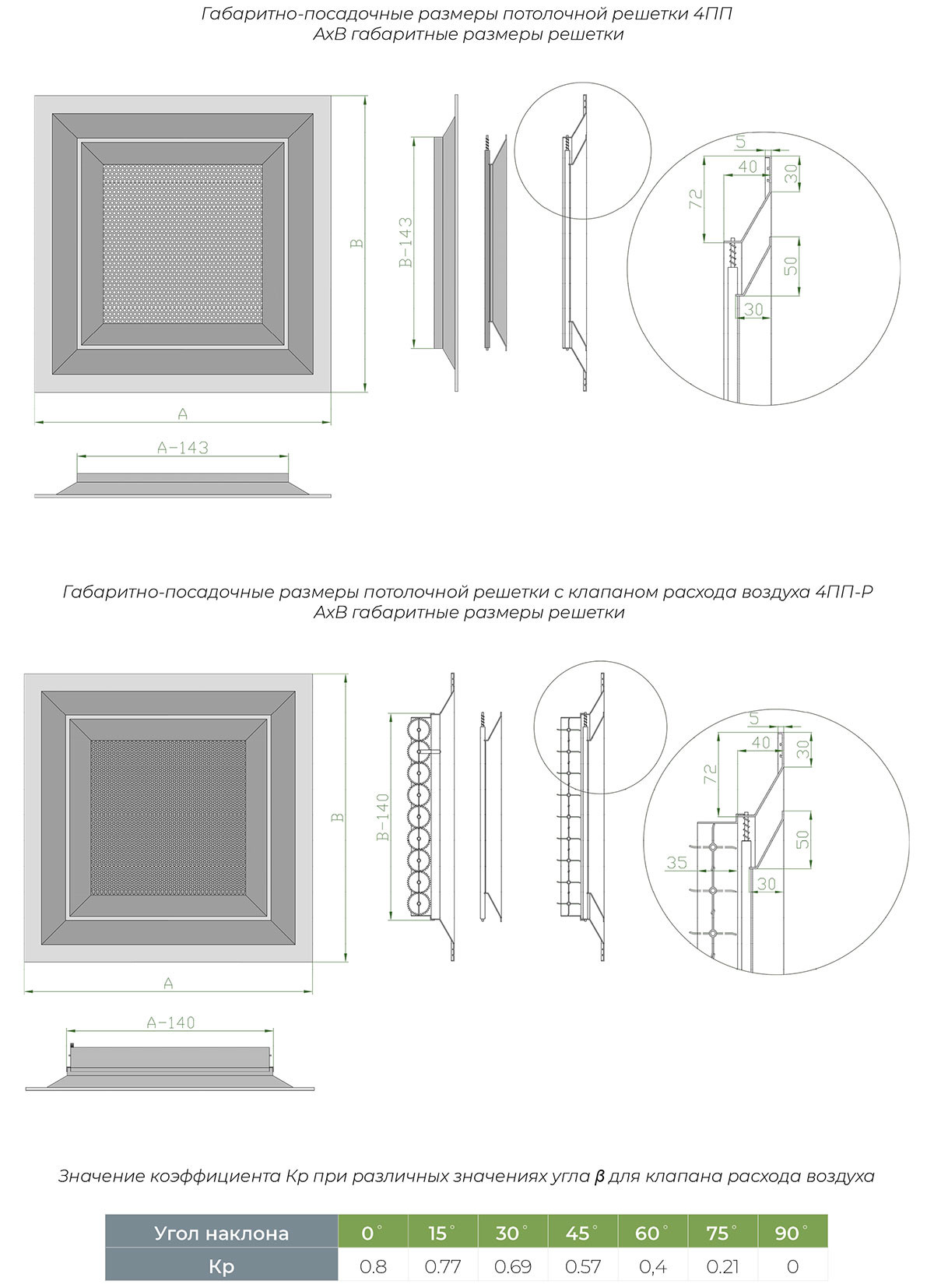 Диффузор состоит из алюминиевой рамки и съемного центрального полотна, сочетающего жалюзи с наклоном 30° и перфорированный лист. Конструкция может комплектоваться клапаном расхода воздуха (модель 4ПП-Р) для регулировки объема подачи воздуха.