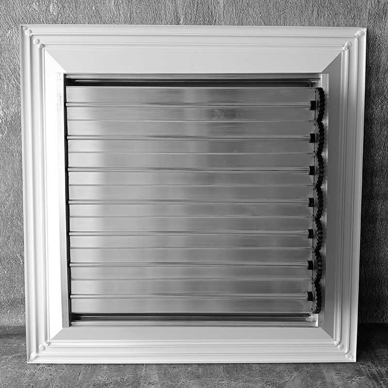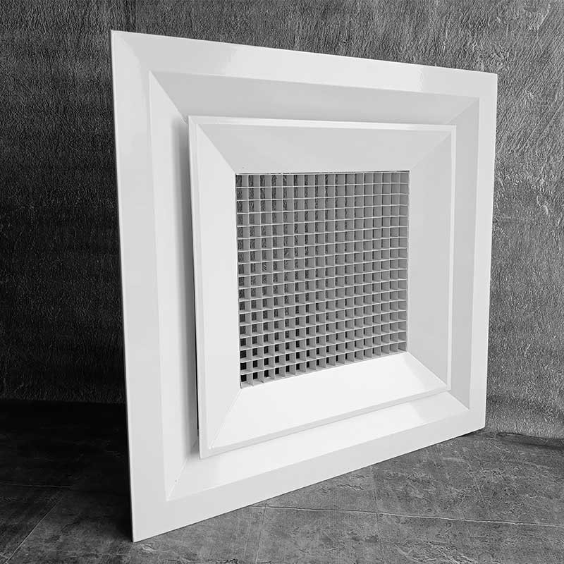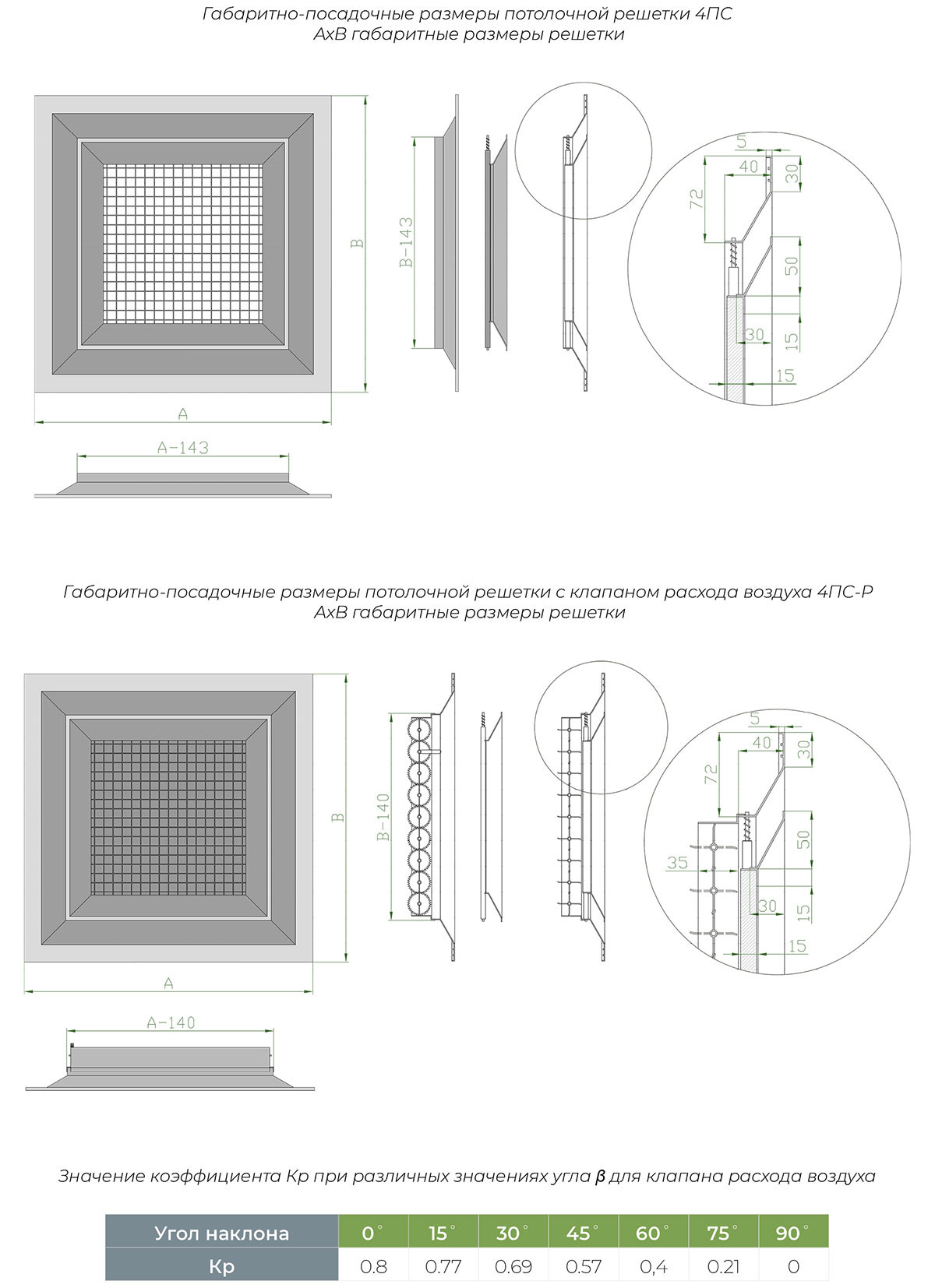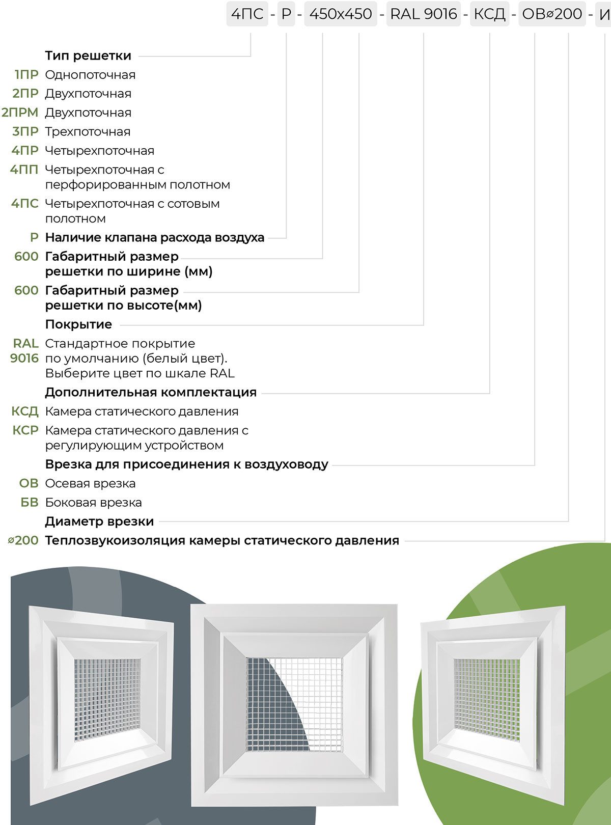 Диффузор состоит из алюминиевой рамки и съемного центрального полотна, сочетающего жалюзи с наклоном 30° и сотовую структуру. Конструкция может комплектоваться клапаном расхода воздуха (модель 4ПС-Р) для регулировки объема подачи воздуха.