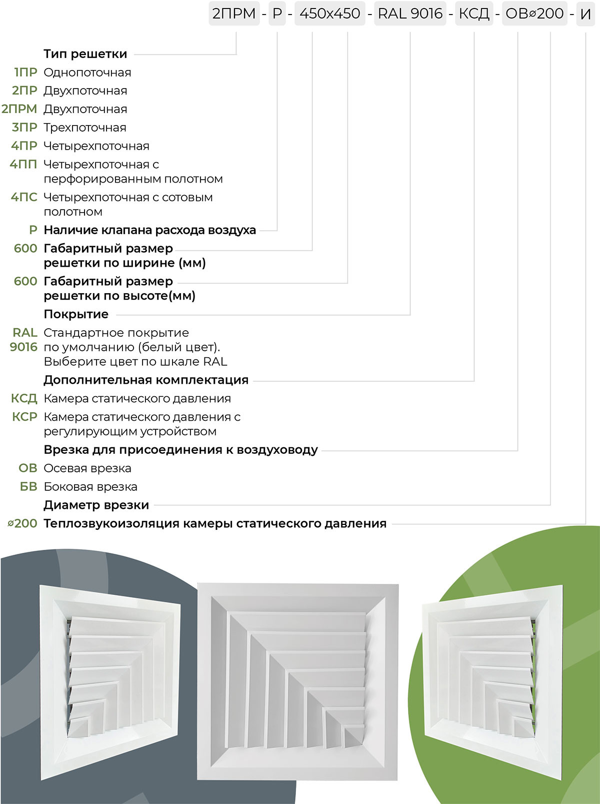 "Решетка 2ПРМ обеспечивает точное направление воздушного потока и может комплектоваться регулирующим клапаном для контроля объема подаваемого воздуха."