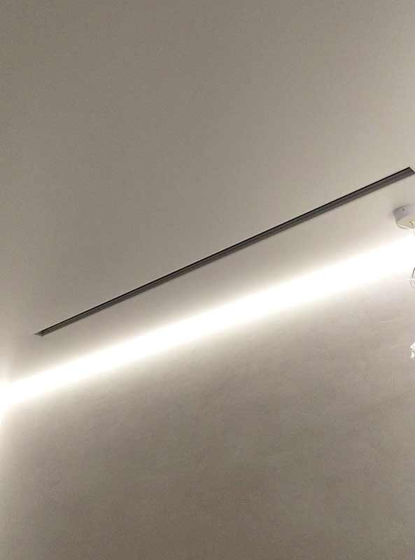 Конструкция профиля включает специальный паз с резиновым демпфером, обеспечивающий надежную фиксацию натяжного полотна (ПВХ или ткань). После установки видимой остается только щелевая часть, что создает эффект минималистичного дизайна.