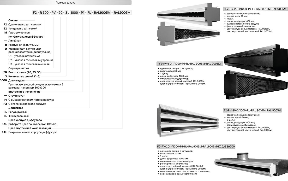 По индивидуальному заказу возможно изготовление радиусных и угловых диффузоров для создания сложных геометрических форм. Также доступны различные варианты направления воздушного потока (вертикальные и наклонные струи под углом 30-60°).