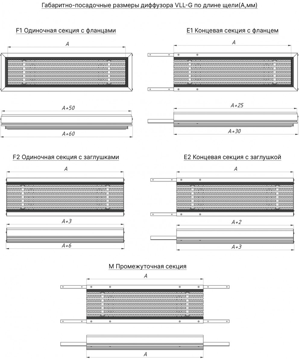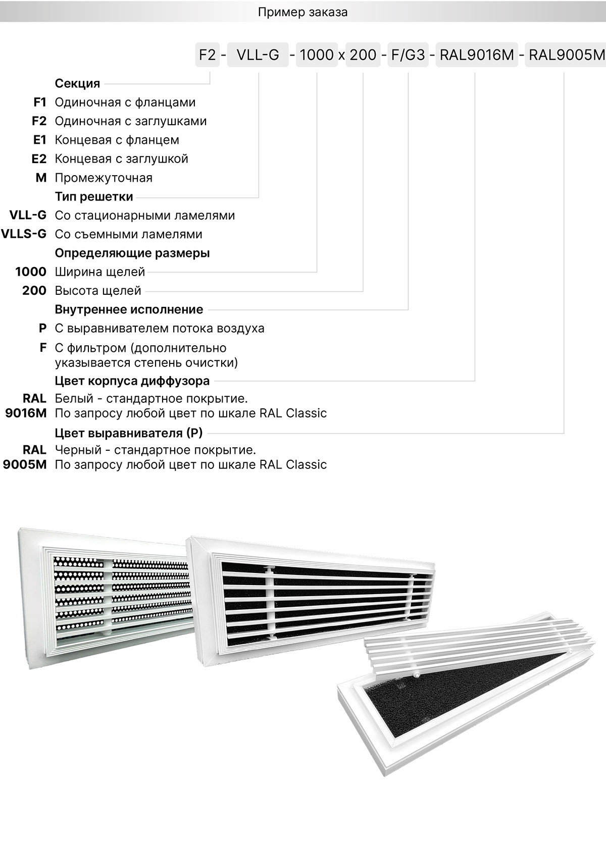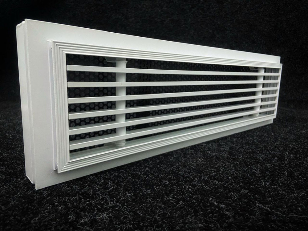 Используемые материалы. Щелевые решетки VLL-G и VLLS-G изготавливаются из экструдированного алюминиевого профиля АД31 по ГОСТ 22233-2018. По умолчанию корпус решетки окрашивается в стандартный белый цвет RAL 9016М матовый, а внутреннее исполнение в чёрный цвет RAL9005М матовый. По индивидуальному заказу возможна окраска в любой цвет по шкале RAL. Статическая камера изготавливается из оцинкованной листовой стали 0,4 - 1,5 мм в зависимости от размера и пожелания заказчика. По умолчанию все изделия поставляются в неокрашенном виде.