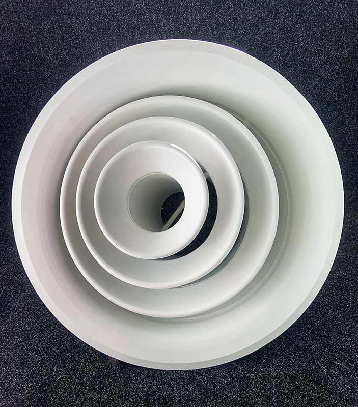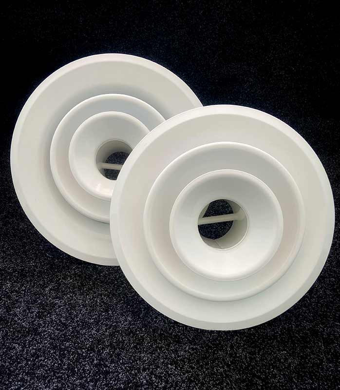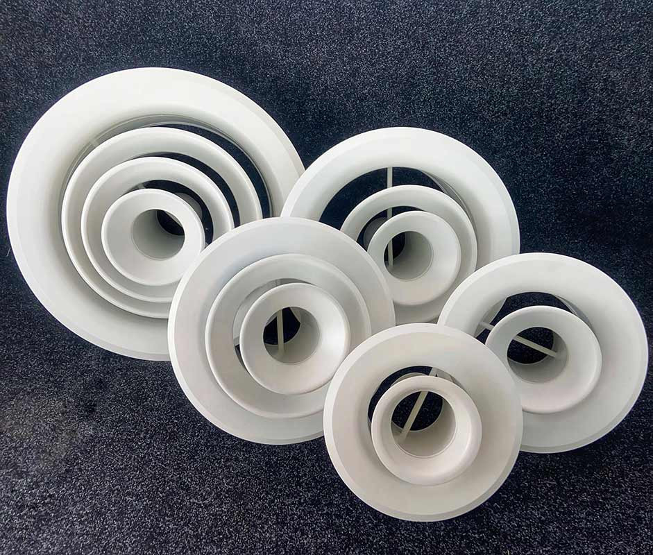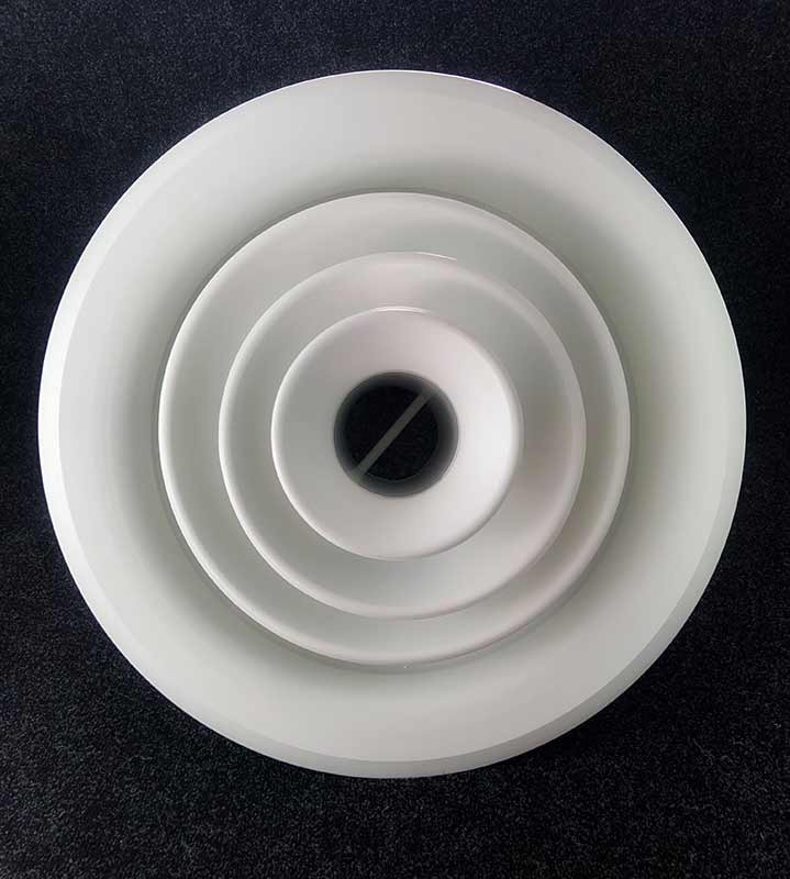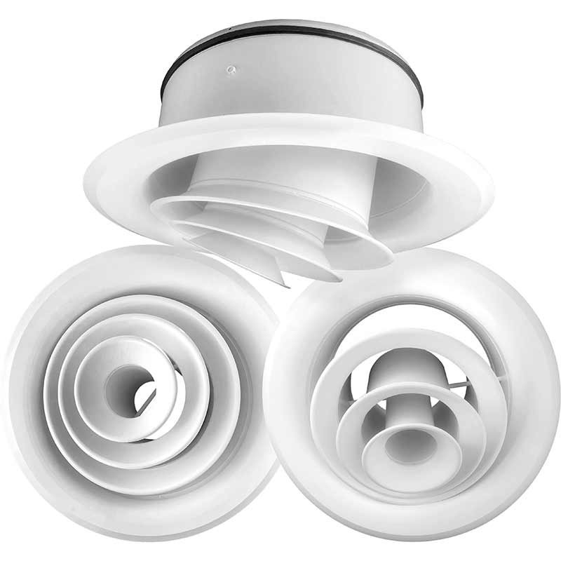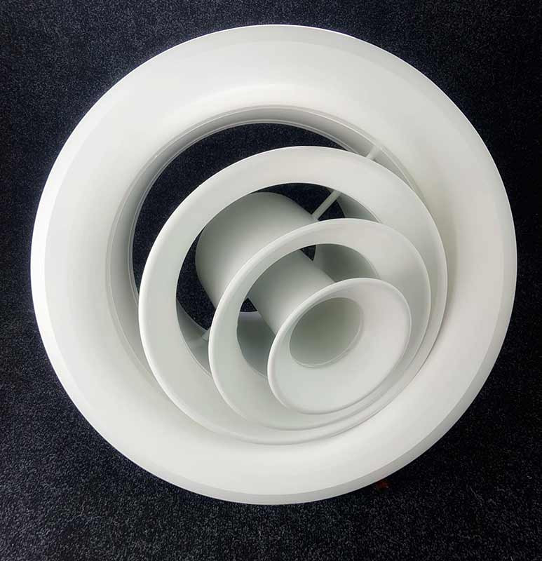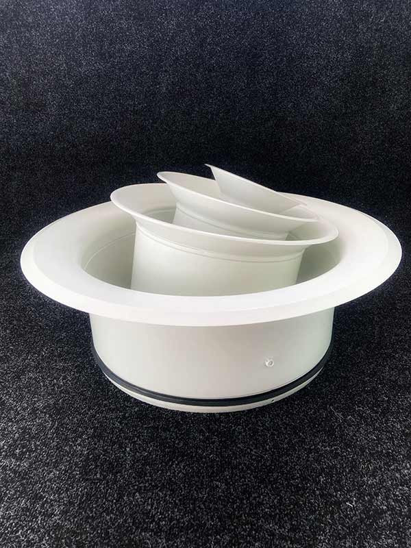 Конструкция диффузора позволяет изменять характер воздушного потока путем поворота центральной вставки. При направлении конического раструба внутрь воздухораспределителя формируется компактная струя, при развороте наружу - коническая.