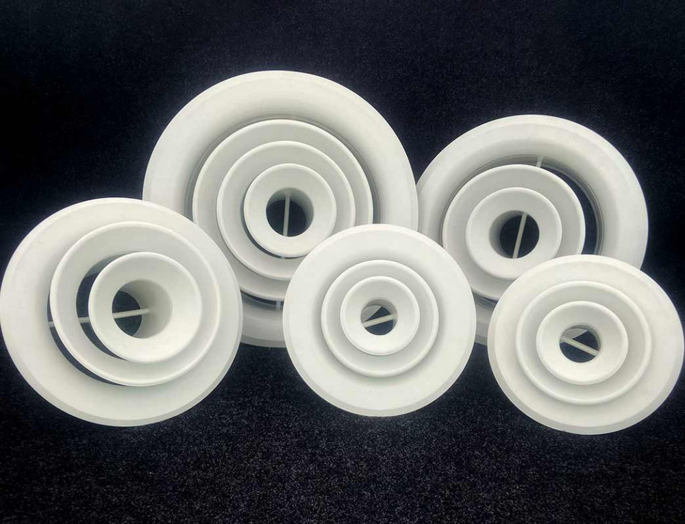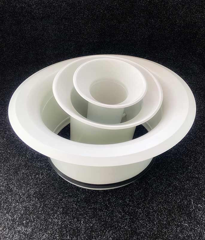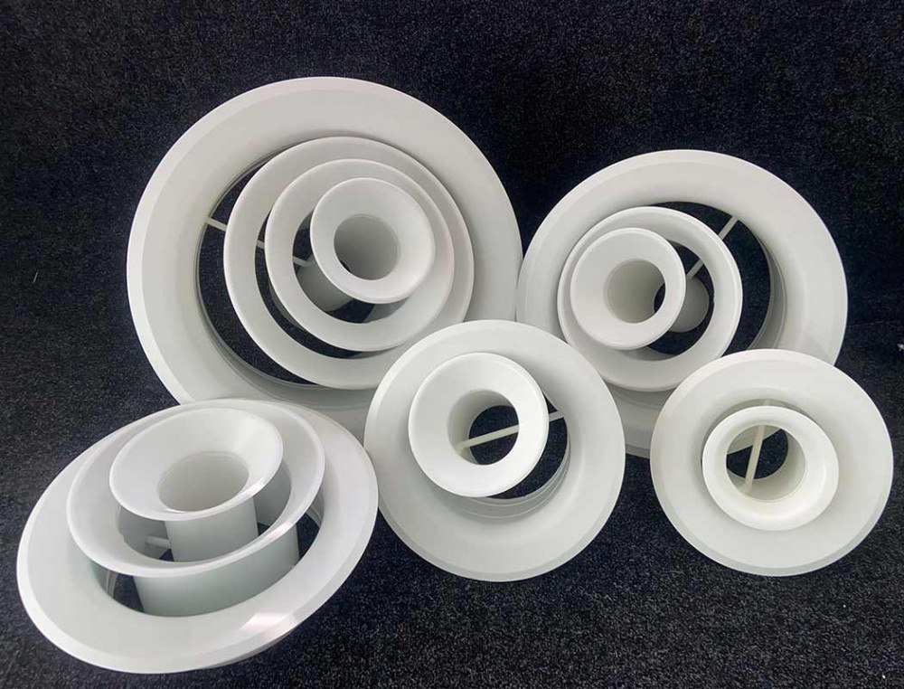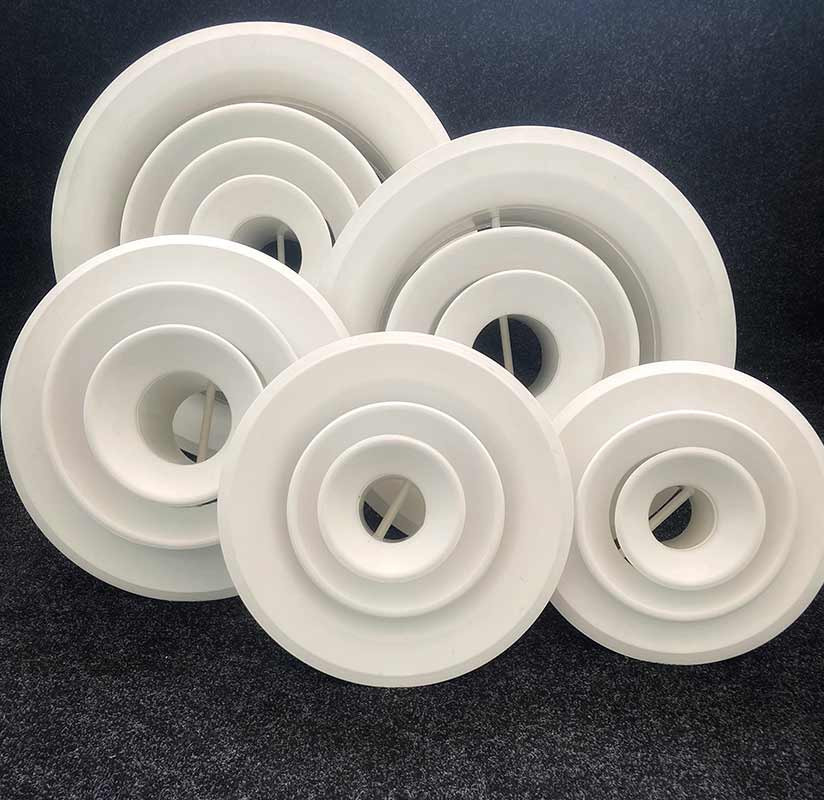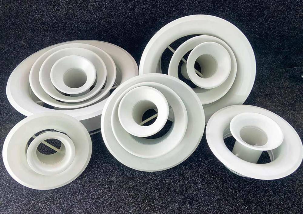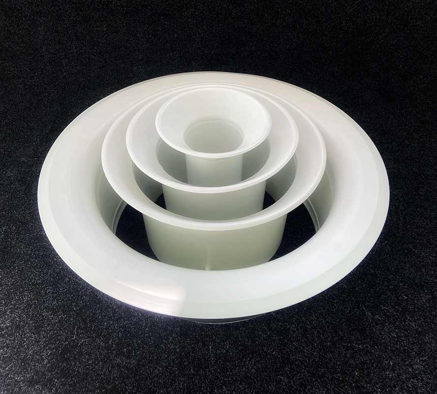 Конструкция диффузора позволяет изменять характер воздушного потока путем поворота центральной вставки. При направлении конического раструба внутрь воздухораспределителя формируется компактная струя, при развороте наружу - коническая.