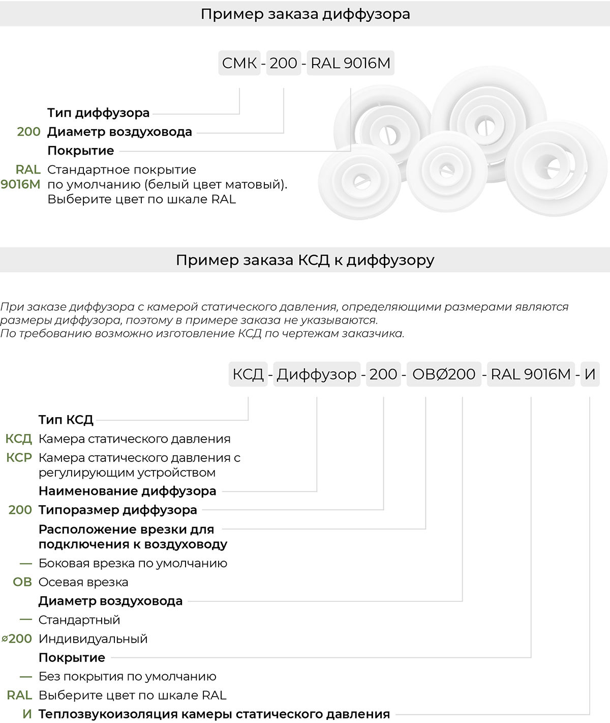 Диффузор изготавливается из оцинкованного листового металлопроката толщиной 0,9 мм. Стандартное покрытие - порошковая полиэфирная эмаль белого цвета RAL 9016М (матовый). По запросу возможно окрашивание в любой цвет по шкале RAL.