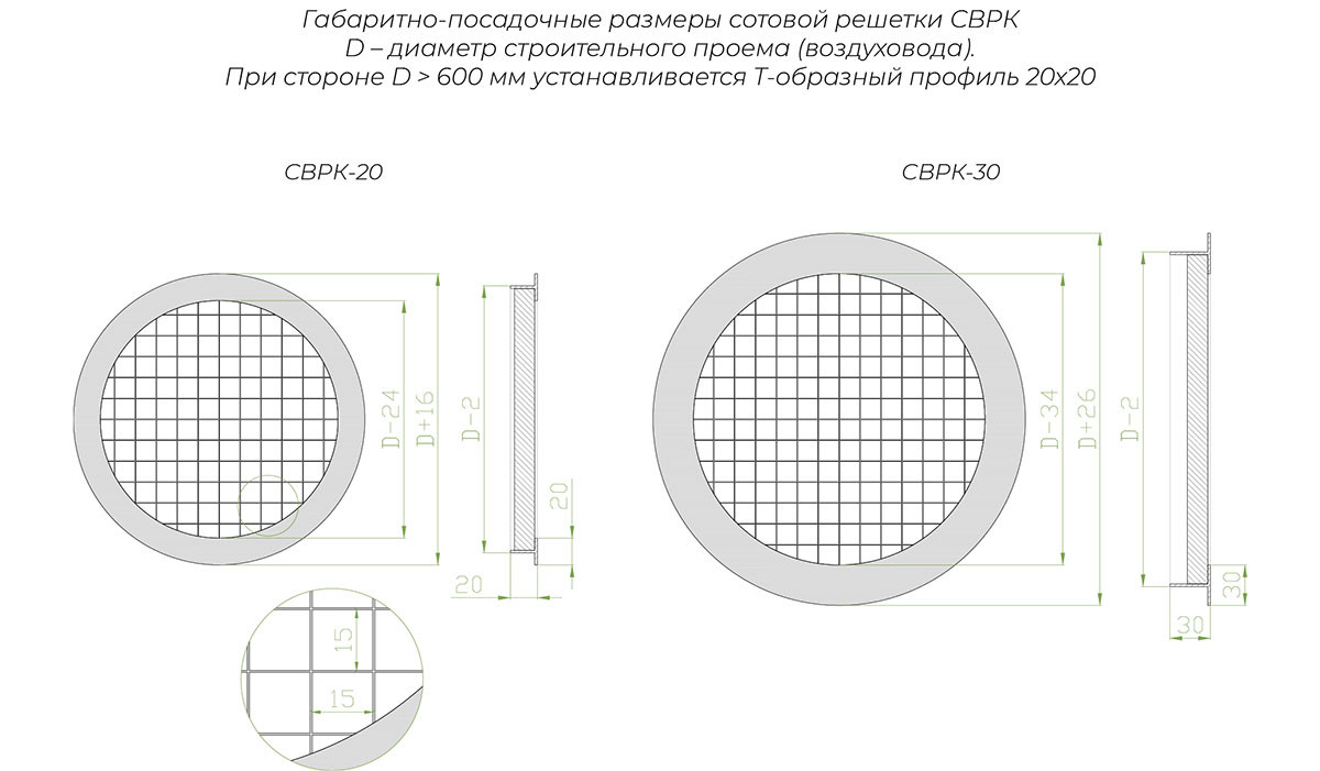 Круглая форма решетки СВРК оптимально подходит для стандартных воздуховодов круглого сечения. Сотовое полотно с квадратными ячейками обеспечивает равномерное распределение воздушного потока при минимальном аэродинамическом сопротивлении. Различные варианты ширины фланца (20, 30 или 40 мм) позволяют адаптировать решетку к конкретным условиям монтажа.