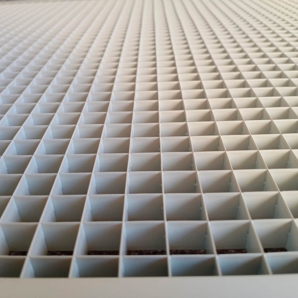 Квадратная форма ячеек обеспечивает равномерное распределение воздушного потока и предотвращает образование турбулентностей. Малый вес конструкции упрощает монтаж и эксплуатацию решетки.