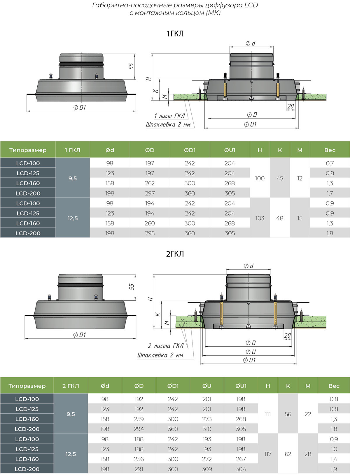 Диффузор LCD-МК представлен в нескольких типоразмерах, соответствующих диаметру подводящего воздуховода: 100, 125, 160 и 200 мм. Это позволяет подобрать оптимальное решение для любого помещения.