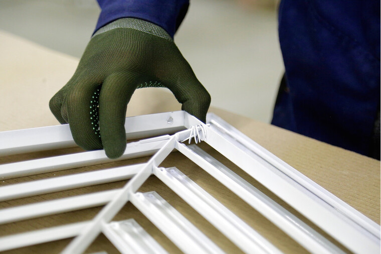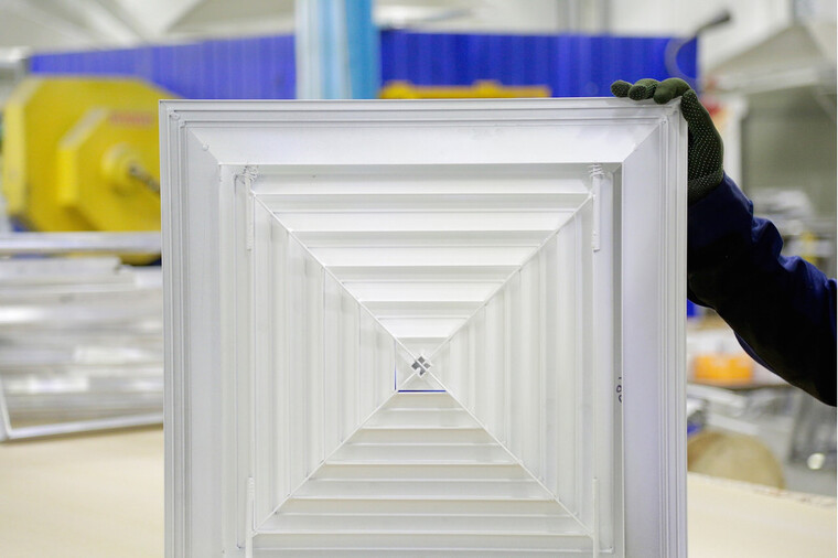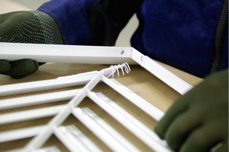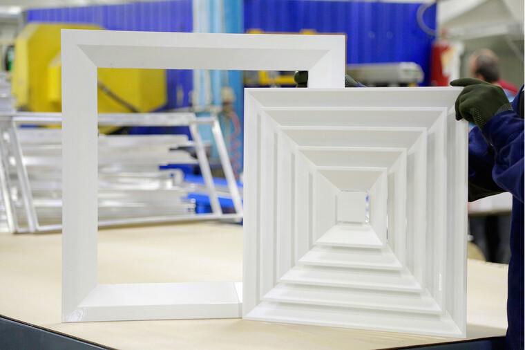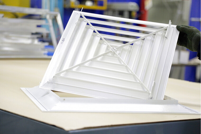 Решетка имеет четырехнаправленную форму ламелей, обеспечивающую равномерное распределение воздушного потока в рабочей зоне. Монтаж осуществляется путем предварительной установки рамки, после чего монтируется внутренняя часть. По индивидуальному заказу рамка может быть оснащена отверстиями для крепежа.