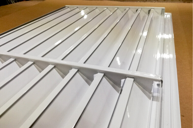 Решетка имеет прямоугольную форму и изготавливается из алюминиевого сплава АД31 с толщиной уголка около 1,5 мм. Кронштейны для фиксации ламелей выполнены из оцинкованной стали. Z-образные ламели ориентированы под углом приблизительно 35° для оптимизации воздушного потока и максимальной защиты от проникновения влаги. Решетка не имеет регулируемых элементов, ламели надежно зафиксированы.