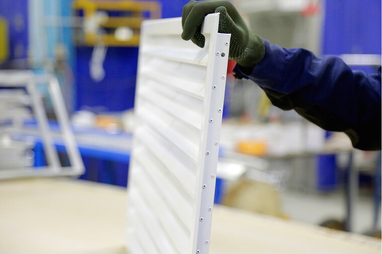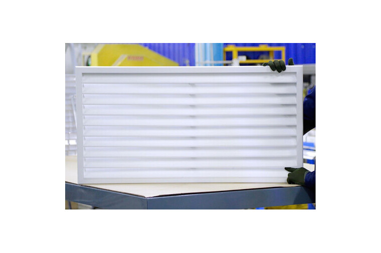 Конструктивно решетка выполнена с использованием сварного каркаса из алюминиевого уголка с сечением 30×30 мм. В качестве жалюзи используются неподвижные Z-образные ламели, расположенные под углом приблизительно 35 градусов. Такая форма ламелей оптимизирует воздушный поток и способствует эффективному отводу влаги, предотвращая ее проникновение внутрь.