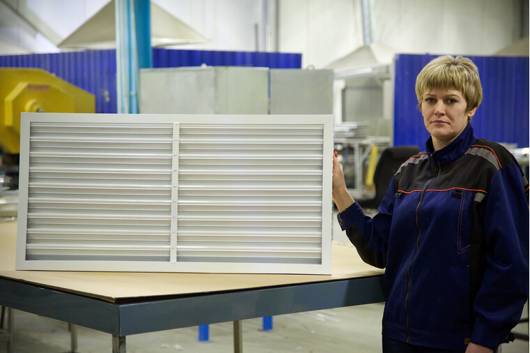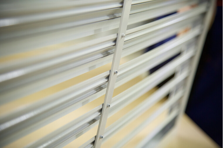 Решетка изготовлена из алюминиевого сплава АД31, что обеспечивает высокую коррозионную стойкость и практически неограниченный срок службы. Рама решетки выполняется из алюминиевого швеллера высотой 30 мм. Ламели имеют Z-образную форму и жестко закреплены в раме. Для предотвращения провисания ламелей на решетках с шириной проема более 800 мм предусмотрена вертикальная усиливающая полоса.