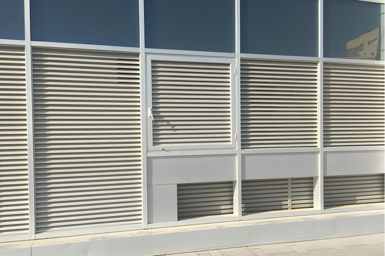 Дверь выполнена на основе алюминиевой рамы, интегрированной с жалюзийной решеткой. Z-образная форма ламелей жалюзи обеспечивает эффективное воздухообменное прохождение при одновременной защите внутреннего пространства от прямого попадания атмосферных осадков. Надежное крепление и фиксация створки достигается за счет использования петель и шпингалетного механизма.