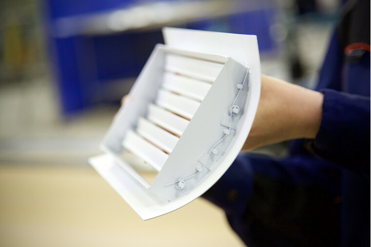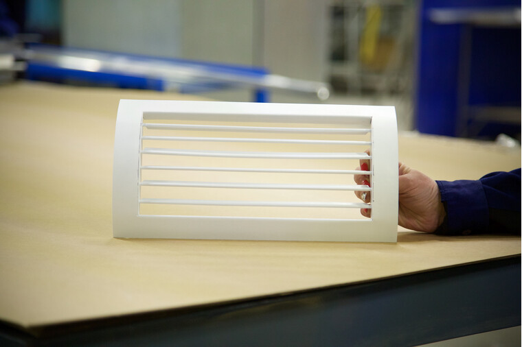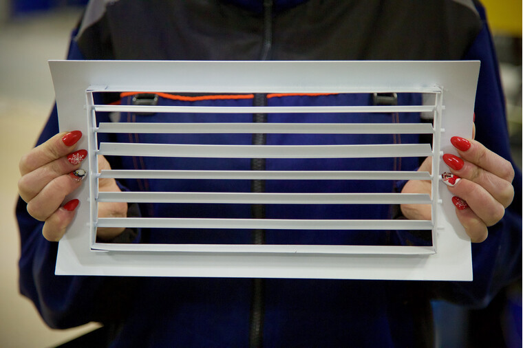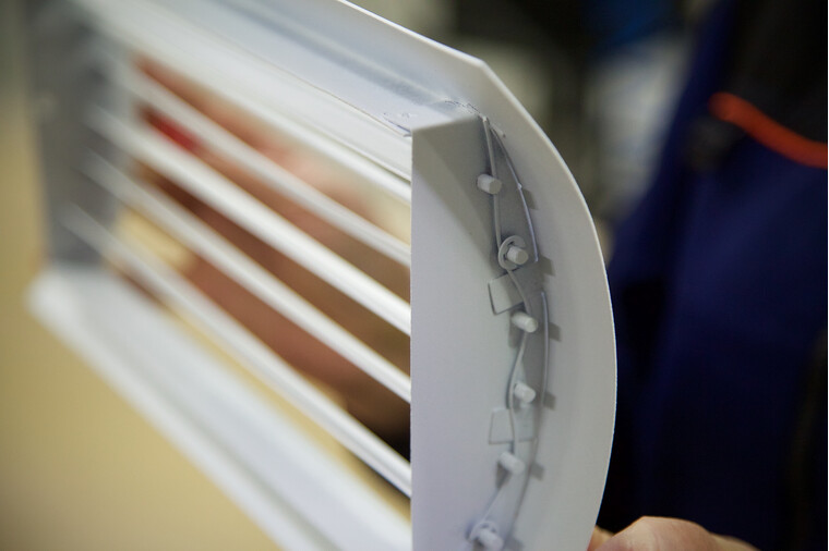 Корпус решетки изготовлен из оцинкованного листа толщиной 1,0 мм, обеспечивая прочность и долговечность изделия. Жалюзи выполнены из алюминиевого профиля и интегрированы в рамку решетки. Каждый элемент жалюзи может быть отрегулирован индивидуально, что позволяет точно направлять поток воздуха в требуемом направлении. Крепление решетки осуществляется посредством стандартного винтового соединения, монтажные отверстия расположены на лицевой стороне рамки.