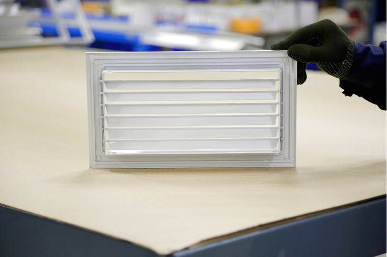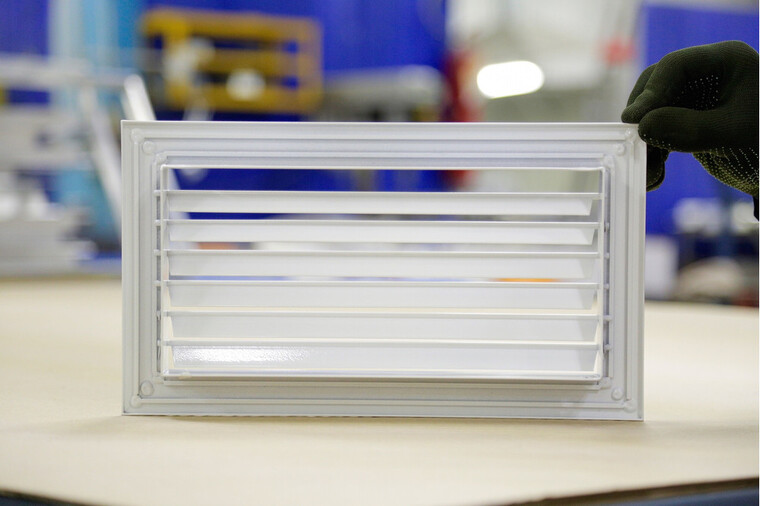 Конструкция решетки состоит из рамы и регулируемых жалюзи. Каждый элемент жалюзи может быть установлен под индивидуальным углом, обеспечивая гибкое управление распределением воздуха. Решетка может быть выполнена с видимыми отверстиями для крепежа на лицевой стороне или с системой скрытого крепления, использующей пружинные защелки. Для решеток с размерами, превышающими 600x600 мм, рекомендуется использовать стандартное крепление.