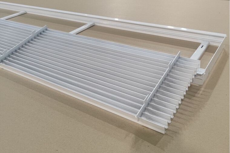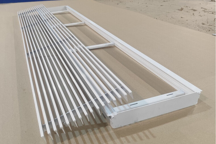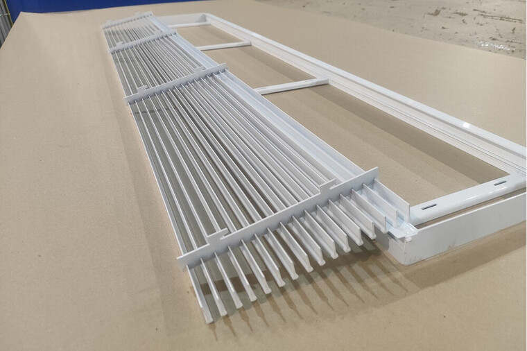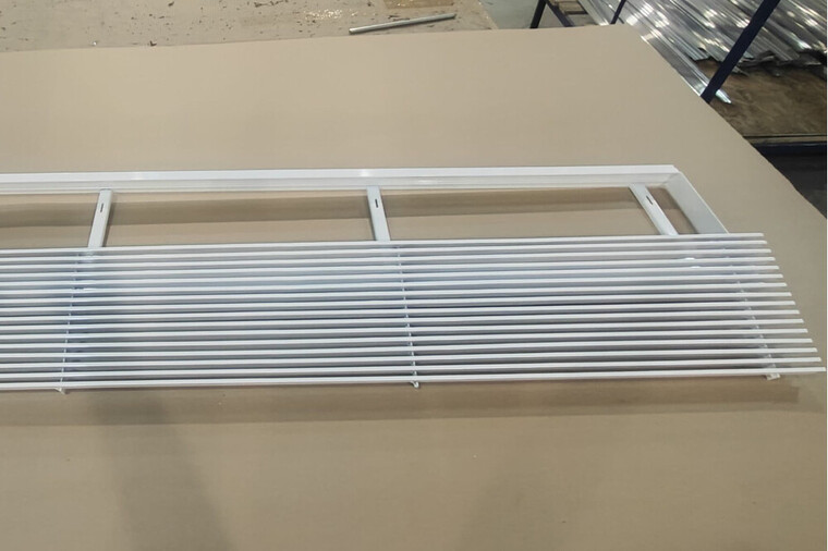 Решетка выполнена из алюминиевого сплава (АД31) с толщиной уголка около 1,5 мм, что гарантирует прочность и долговечность изделия. Ламели имеют фиксированное положение, обеспечивая оптимальный воздушный поток и сохраняя эстетичный внешний вид. Поверхность покрыта порошковой краской, доступной в любом цвете по шкале RAL, что обеспечивает защиту от коррозии и выцветания, а также позволяет подобрать идеальное цветовое решение под интерьер. Глубина решетки составляет приблизительно 39 мм.