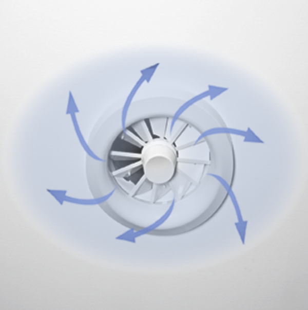 Круглые потолочные диффузоры с регулируемым направлением потока воздуха, предназначенные для бесквозняковой подачи воздуха в зоны пребывания людей в режимах обогрева и охлаждения.