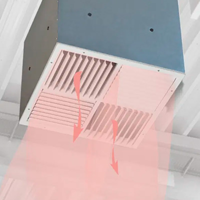 - Регулировка подачи воздуха: направление воздушных потоков может быть изменено вручную или с помощью опционального привода, что позволяет адаптировать работу диффузора к различным условиям эксплуатации, включая горизонтальную и вертикальную подачу воздуха.