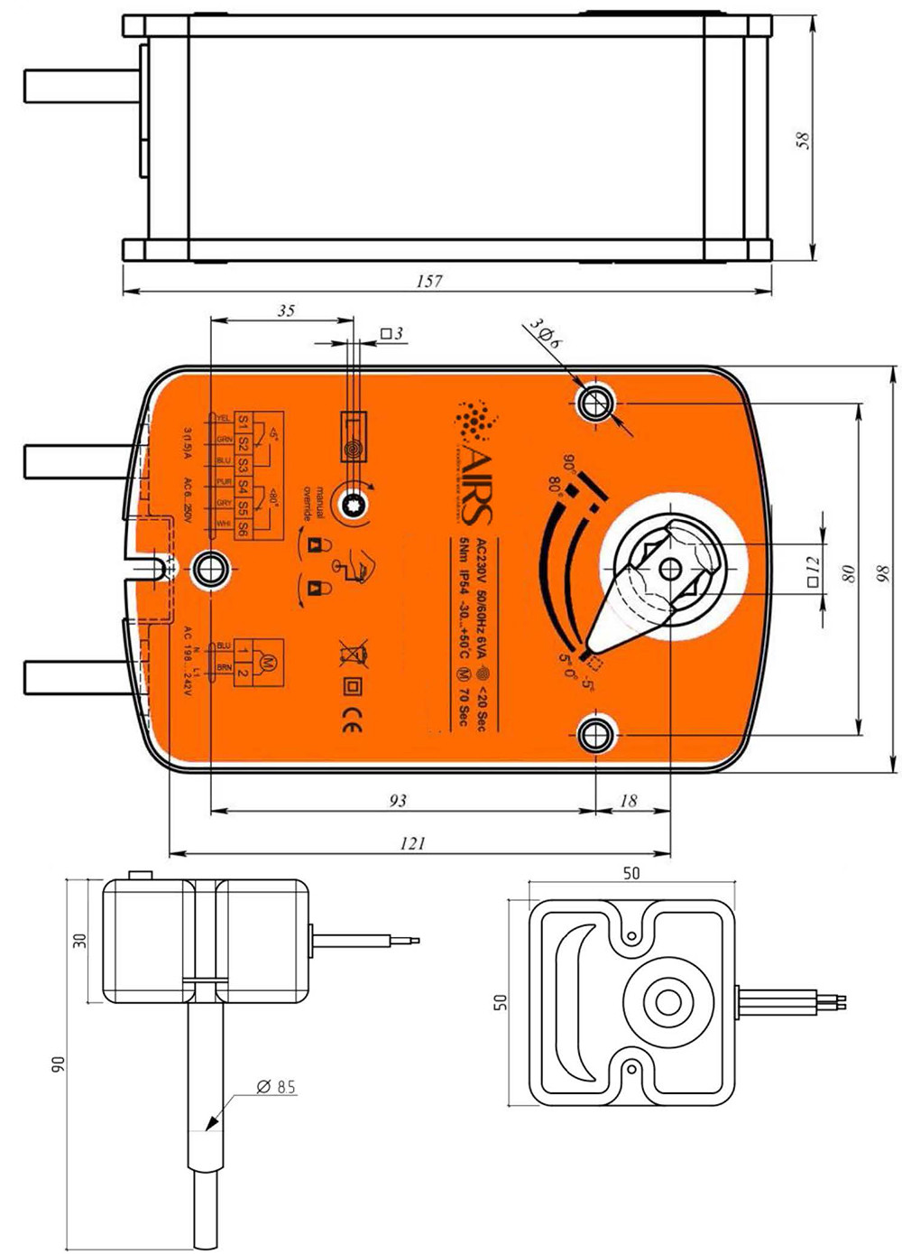 Установка привода осуществляется на клапаны с квадратным валом 12 мм через крепежные отверстия ø6 мм. Особенности конструкции: