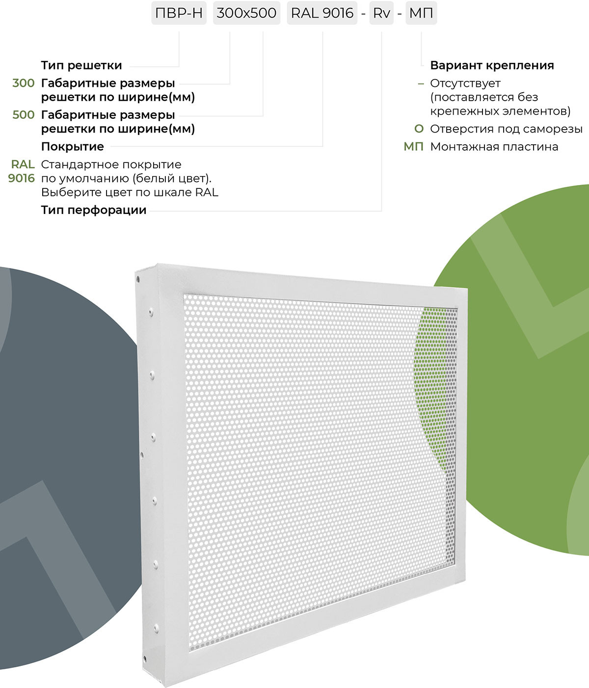 Решетка ПВР-Н выполнена в накладном исполнении и состоит из алюминиевой рамки (профиль АДЗ1 по ГОСТ 22233-2001) и перфорированной вставки из оцинкованной стали. Стандартная комплектация включает круглую перфорацию RV 5-7 со смещенными рядами отверстий.