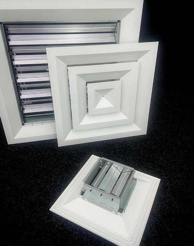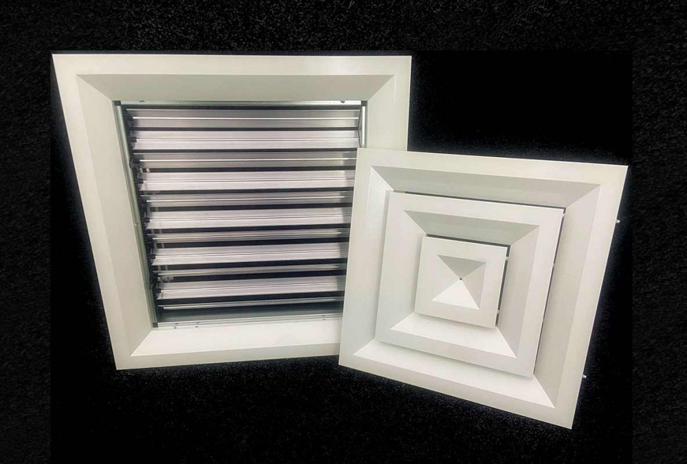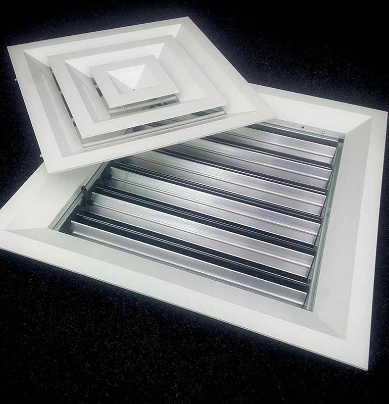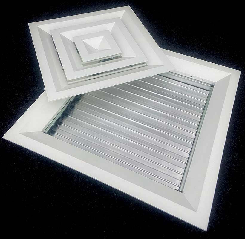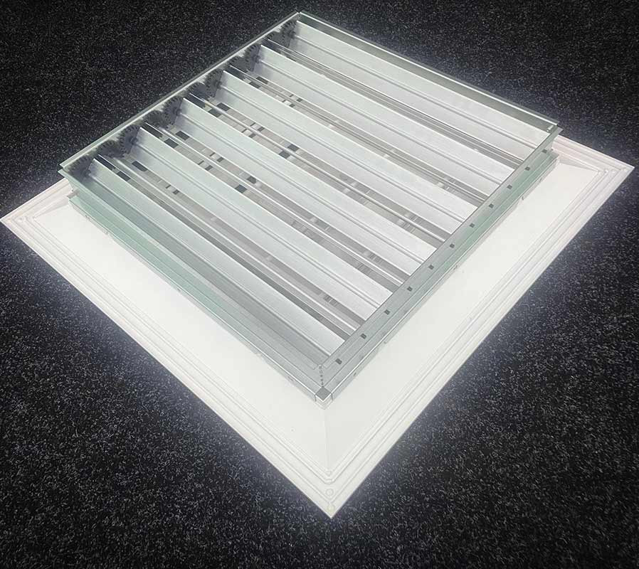 Клапан расхода воздуха состоит из рамки с подвижными лопатками, положение которых изменяется при помощи ручки. Это позволяет точно регулировать интенсивность воздушного потока. КРВ поставляется без покрытия, в то время как сама решетка имеет стандартное покрытие порошковой краской RAL 9016 (белый) с возможностью выбора других цветов по шкале RAL.