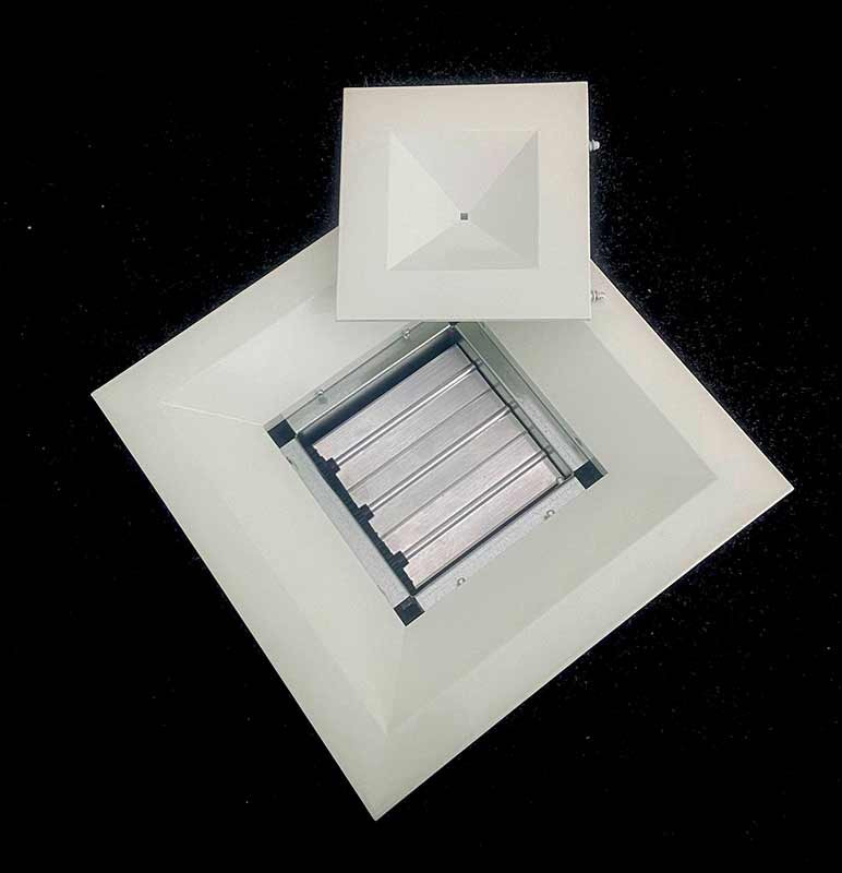 Решетка потолочная 4А-Р представляет собой современное решение для систем вентиляции и кондиционирования, сочетающее функции распределения воздушных потоков и регулировки их объема. Модель разработана для интеграции в подвесные потолки типа Армстронг, где размеры решетки соответствуют стандартным потолочным ячейкам.