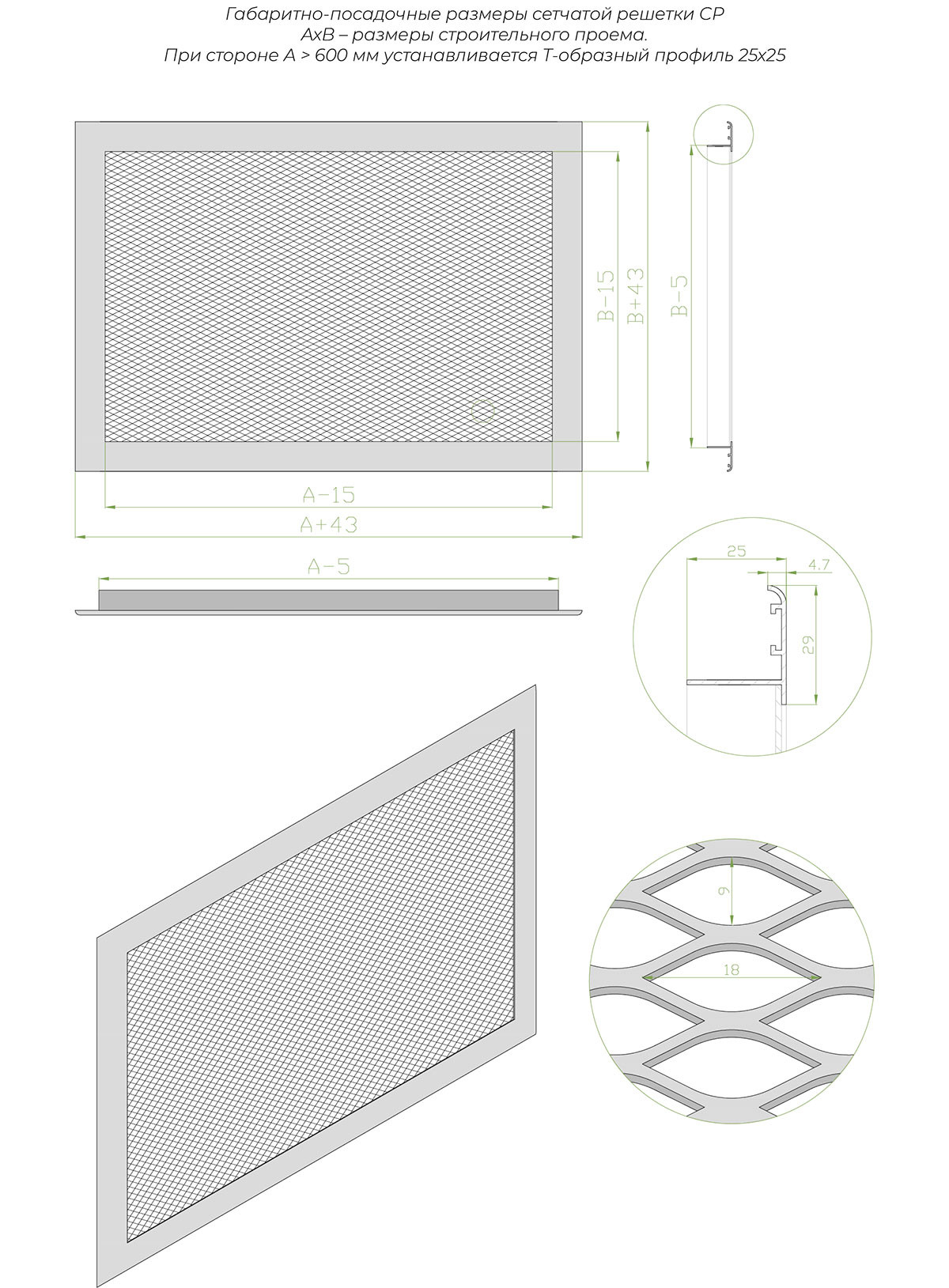 Решетка СР состоит из алюминиевой рамки (профиль АДЗ1 по ГОСТ 22233-2001) с закрепленной стальной сеткой при помощи вытяжных заклепок. Стандартная комплектация включает просечно-вытяжную сетку 12×6 мм, с возможностью замены на сетку 10×10 мм по запросу.