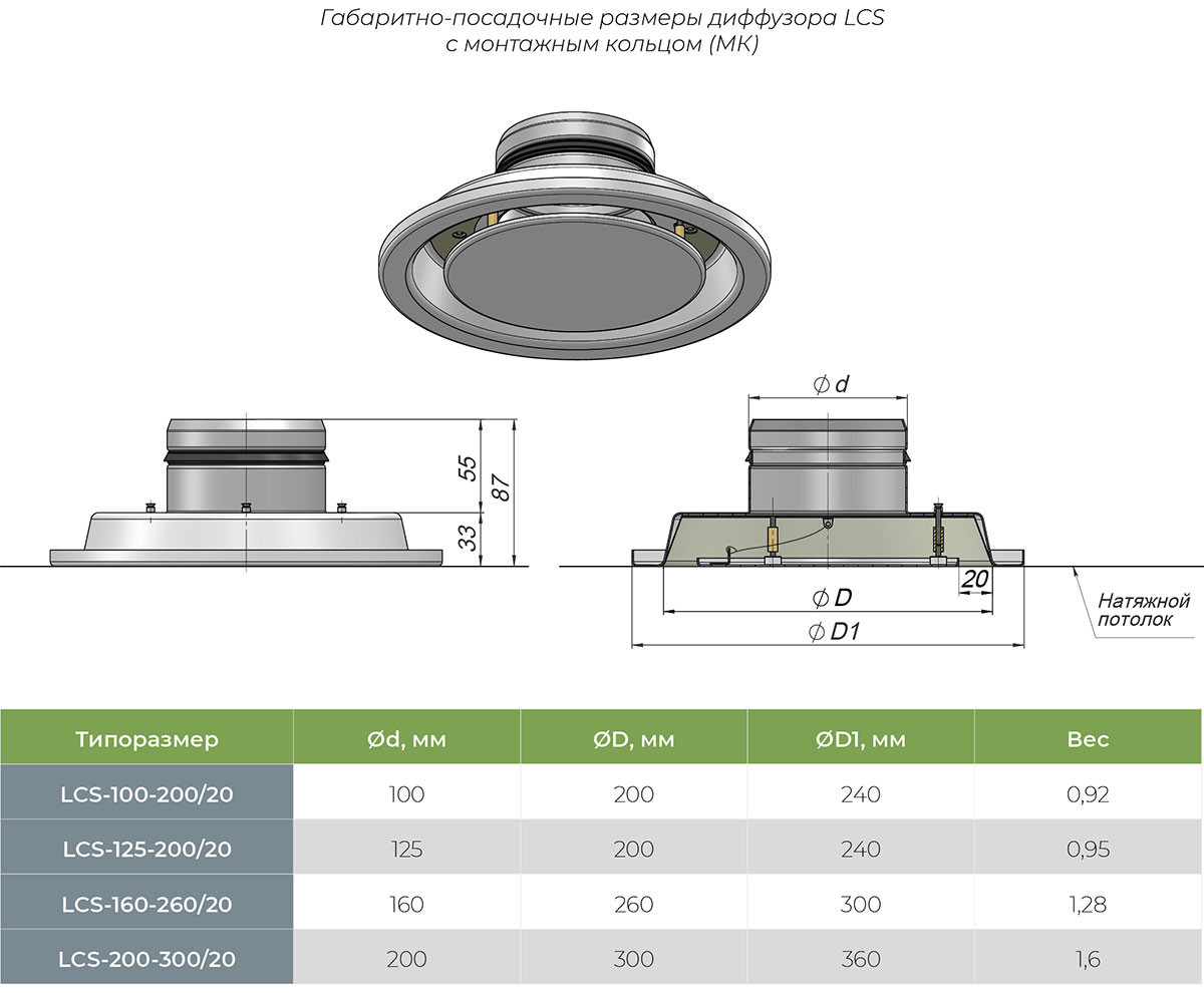Диффузор LCS-МК изготавливается из оцинкованной стали толщиной 0,9 мм и имеет несколько стандартных типоразмеров: