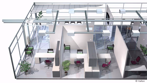 Диффузор обеспечивает стабильную дальность струи при различных расходах воздуха, что гарантирует распределение воздуха без сквозняков. Он разработан для интеграции с системами Halton Workplace и идеально подходит для требовательных офисных условий. Конструкция диффузора предусматривает установку в подвесной потолок.