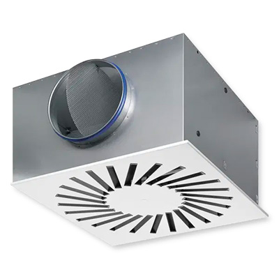 Потолочные вихревые диффузоры серии BB предназначены для создания интенсивного перемешивания воздуха в помещениях с большими расходами воздушных потоков. Благодаря конструктивным особенностям, диффузор обеспечивает высокий уровень эжекции, что способствует быстрому выравниванию температур и снижению скорости приточного воздуха, создавая комфортные условия в зонах пребывания людей. Это достигается за счет формирования вихревого потока, который эффективно смешивает приточный и комнатный воздух, обеспечивая равномерное распределение воздушных масс по всему объему помещения с минимальной турбулентностью в рабочей зоне.