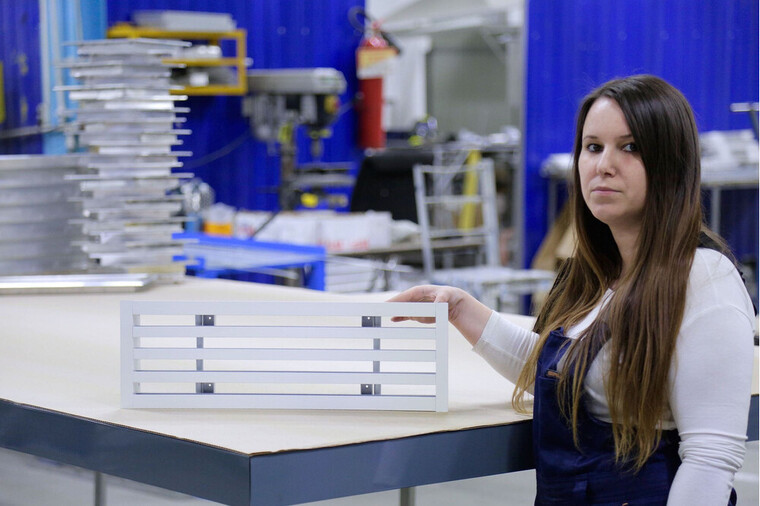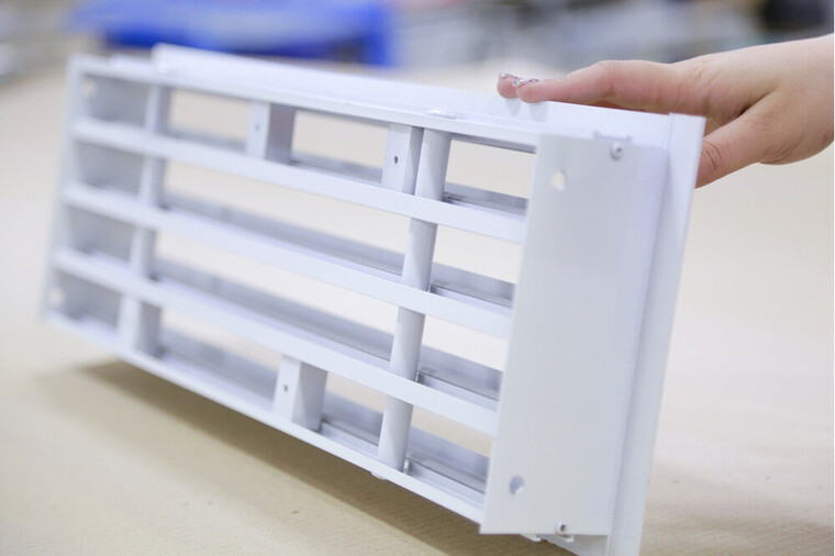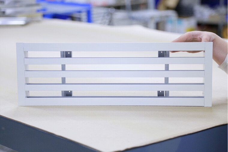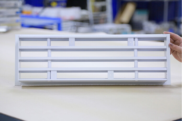 Воздухораспределитель изготовлен из алюминиевого профиля и может иметь от одной до шести щелей. Стандартная комплектация включает гладкий фланец (рамку) без предварительно подготовленных отверстий для монтажа. По индивидуальному заказу возможно изготовление рамки с отверстиями для крепления саморезами.